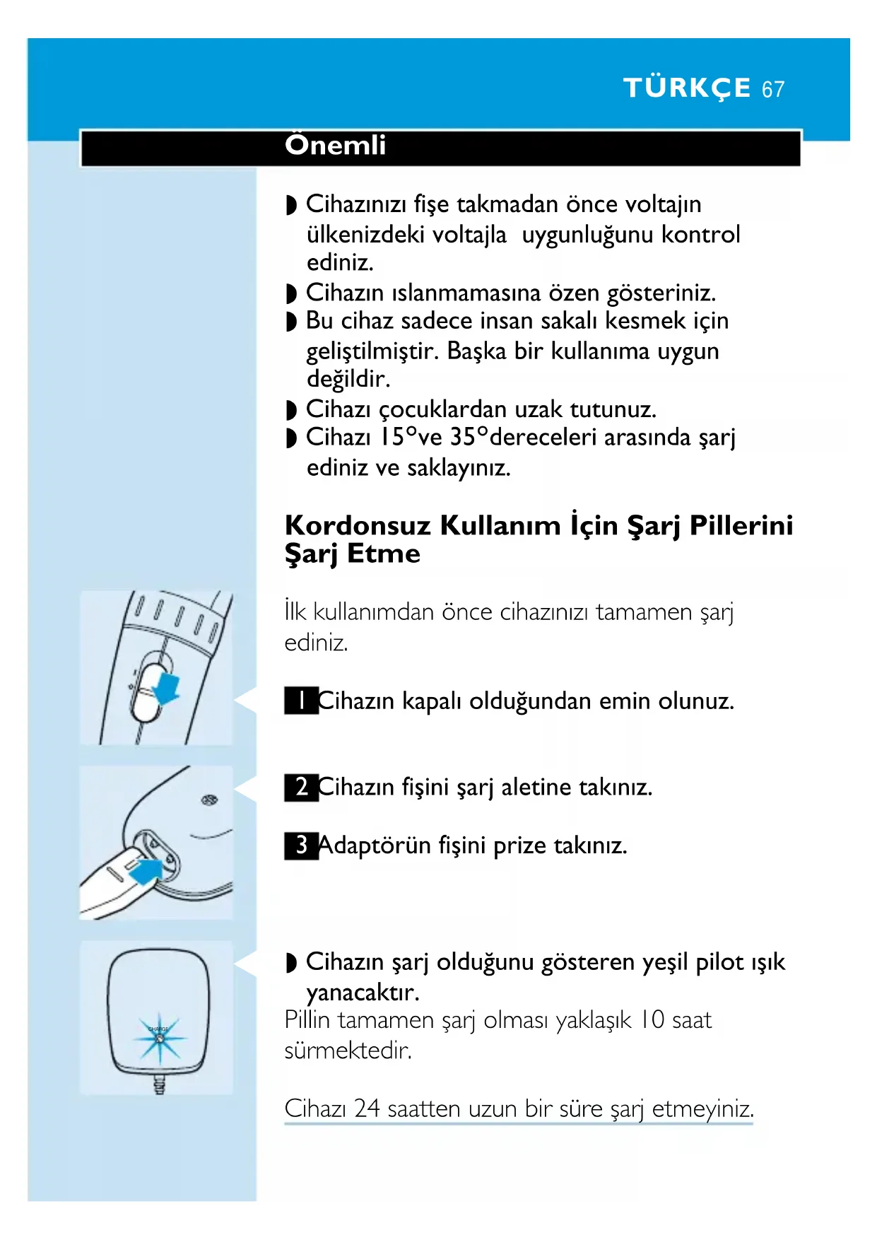 Cihazı 24 saatten uzun bir süre şarj etmeyiniz.
