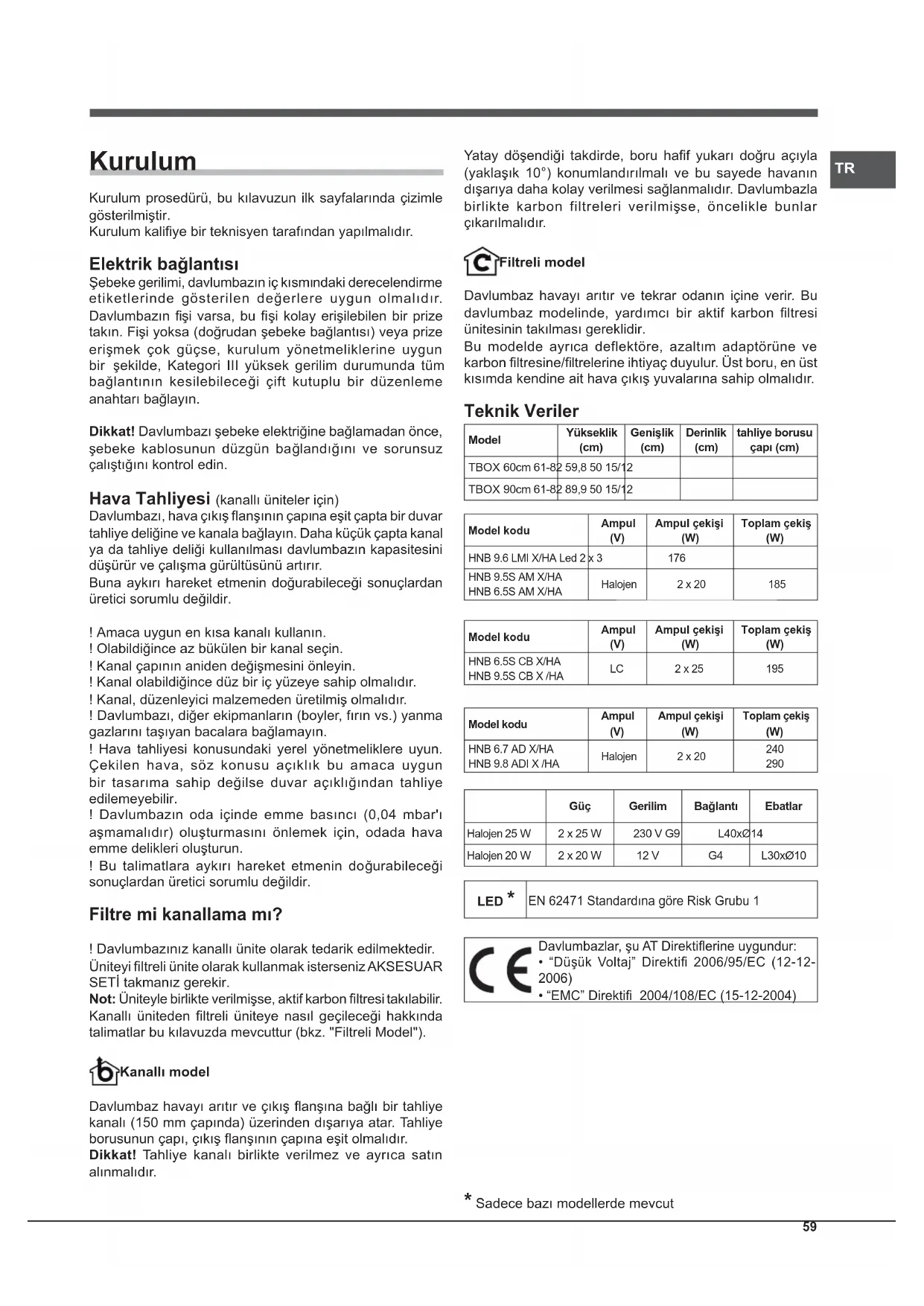 Güç Gerilim Bağlantı Ebatlar Halojen 25 W 2 x 25 W 230 V G9 L40xØ14Halojen 20 W 2 x 20 W 12 V G4 L30xØ10 LED *EN 62471 Standardına göre Risk Grubu 1 Davlumbazlar, şu AT Direktifl erine uygundur: