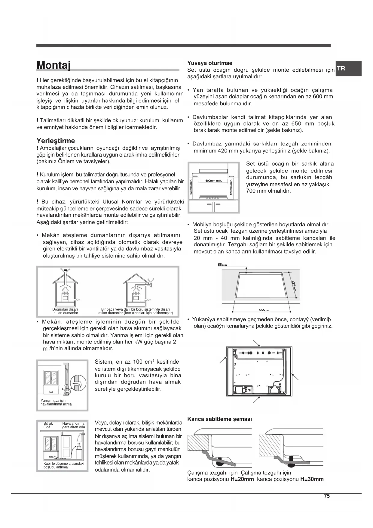 Yanıcı hava için havalandırma açmaKapı ile döşeme arasındaki boşluğu arttırmaBitişik Oda Havalandırma gerektiren oda Yuvaya oturtmae Set üstü ocağın doğru şekilde monte edilebilmesi için aşağıdaki şartlara uyulmalıdır: