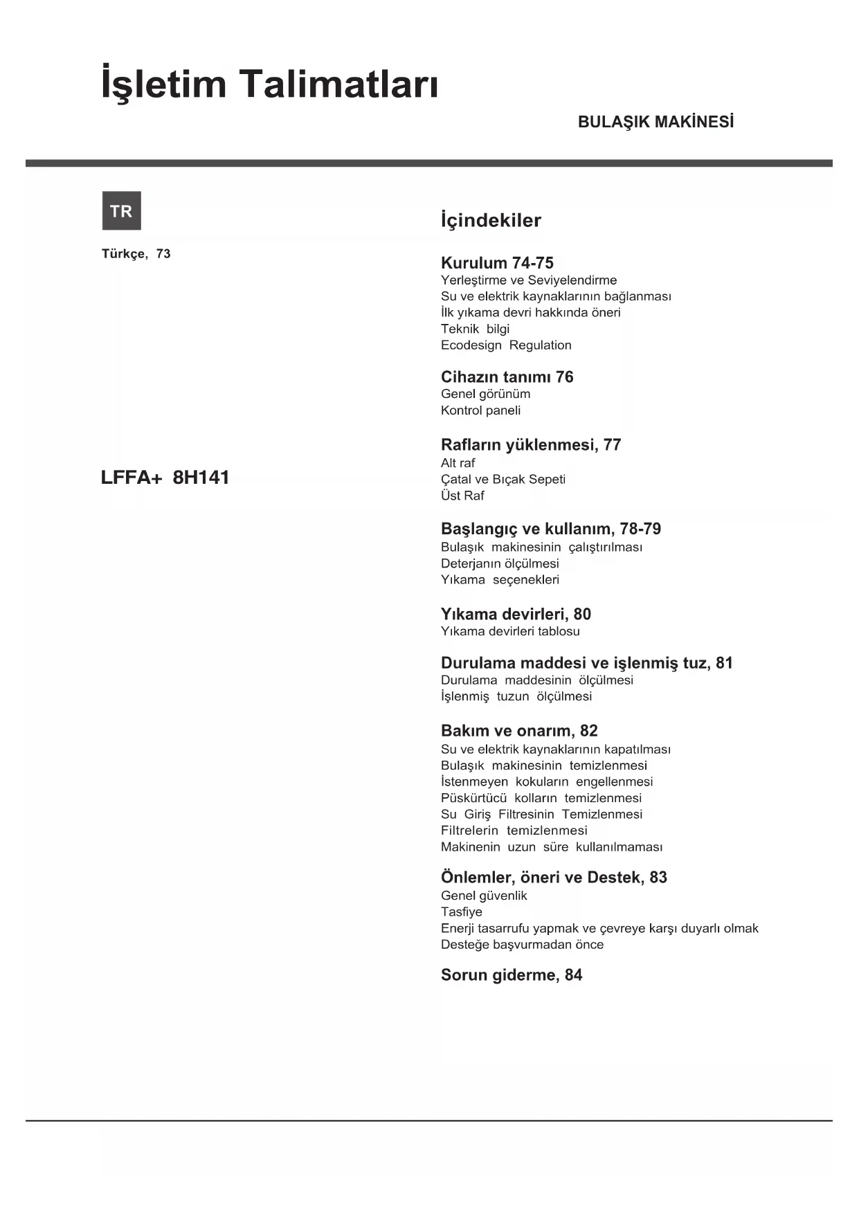 Ýçindekiler Kurulum 74-75 Yerleþtirme ve Seviyelendirme Su ve elektrik kaynaklarýnýn baðlanmasý Ýlk yýkama devri hakkýnda öneri Teknik bilgi Ecodesign Regulation Cihazýn tanýmý 76 Genel görünüm Kontrol paneli Raflarýn yüklenmesi, 77 Alt raf Çatal ve Býçak Sepeti Üst Raf Baþlangýç ve kullaným, 78-79 Bulaþýk makinesinin çalýþtýrýlmasý Deterjanýn ölçülmesi Yýkama seçenekleri Yýkama devirleri, 80 Yýkama devirleri tablosu Durulama maddesi ve iþlenmiþ tuz, 81 Durulama maddesinin ölçülmesi Ýþlenmiþ tuzun ölçülmesi Bakým ve onarým, 82 Su ve elektrik kaynaklarýnýn kapatýlmasý Bulaþýk makinesinin temizlenmesi Ýstenmeyen kokularýn engellenmesi Püskürtücü kollarýn temizlenmesi Su Giriþ Filtresinin Temizlenmesi Filtrelerin temizlenmesi Makinenin uzun süre kullanýlmamasý Önlemler, öneri ve Destek, 83 Genel güvenlik Tasfiye Enerji tasarrufu yapmak ve çevreye karþý duyarlý olmak Desteðe baþvurmadan önce Sorun giderme, 84