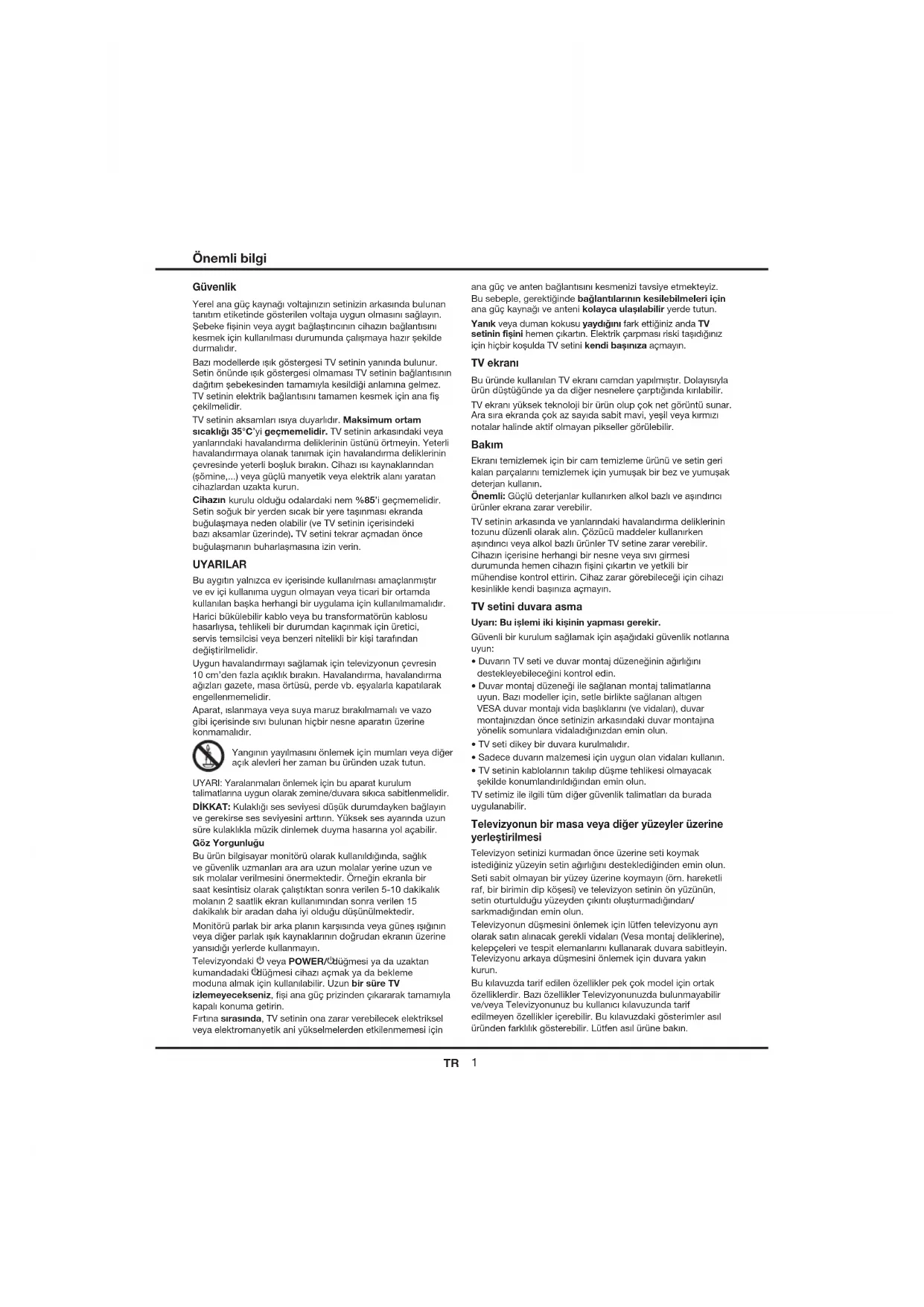 Önemli bilgi Güvenlik Yerel ana güç kaynağı voltajınızın setinizin arkasında bulunan tanıtım etiketinde gösterilen voltaja uygun olmasını sağlayın. Șebeke fișinin veya aygıt bağlaștırıcının cihazın bağlantısını kesmek için kullanılması durumunda çalıșmaya hazır șekilde durmalıdır. Bazı modellerde ıșık göstergesi TV setinin yanında bulunur. Setin önünde ıșık göstergesi olmaması TV setinin bağlantısının dağıtım șebekesinden tamamıyla kesildiği anlamına gelmez. TV setinin elektrik bağlantısını tamamen kesmek için ana fiș çekilmelidir. TV setinin aksamları ısıya duyarlıdır. Maksimum ortam sıcaklığı 35°C’yi geçmemelidir. TV setinin arkasındaki veya yanlarındaki havalandırma deliklerinin üstünü örtmeyin. Yeterli havalandırmaya olanak tanımak için havalandırma deliklerinin çevresinde yeterli boșluk bırakın. Cihazı ısı kaynaklarından (șömine,...) veya güçlü manyetik veya elektrik alanı yaratan cihazlardan uzakta kurun. Cihazın kurulu olduğu odalardaki nem %85’i geçmemelidir. Setin soğuk bir yerden sıcak bir yere tașınması ekranda buğulașmaya neden olabilir (ve TV setinin içerisindeki bazı aksamlar üzerinde). TV setini tekrar açmadan önce buğulașmanın buharlașmasına izin verin. UYARILAR Bu aygıtın yalnızca ev içerisinde kullanılması amaçlanmıștır ve ev içi kullanıma uygun olmayan veya ticari bir ortamda kullanılan bașka herhangi bir uygulama için kullanılmamalıdır. Harici bükülebilir kablo veya bu transformatörün kablosu hasarlıysa, tehlikeli bir durumdan kaçınmak için üretici, servis temsilcisi veya benzeri nitelikli bir kiși tarafından değiștirilmelidir. Uygun havalandırmayı sağlamak için televizyonun çevresin 10 cm’den fazla açıklık bırakın. Havalandırma, havalandırma ağızları gazete, masa örtüsü, perde vb. eșyalarla kapatılarak engellenmemelidir. Aparat, ıslanmaya veya suya maruz bırakılmamalı ve vazo gibi içerisinde sıvı bulunan hiçbir nesne aparatın üzerine konmamalıdır. Yangının yayılmasını önlemek için mumları veya diğer açık alevleri her zaman bu üründen uzak tutun. UYARI: Yaralanmaları önlemek için bu aparat kurulum talimatlarına uygun olarak zemine/duvara sıkıca sabitlenmelidir. DİKKAT: Kulaklığı ses seviyesi düșük durumdayken bağlayın ve gerekirse ses seviyesini arttırın. Yüksek ses ayarında uzun süre kulaklıkla müzik dinlemek duyma hasarına yol açabilir. Göz Yorgunluğu Bu ürün bilgisayar monitörü olarak kullanıldığında, sağlık ve güvenlik uzmanları ara ara uzun molalar yerine uzun ve sık molalar verilmesini önermektedir. Örneğin ekranla bir saat kesintisiz olarak çalıștıktan sonra verilen 5-10 dakikalık molanın 2 saatlik ekran kullanımından sonra verilen 15 dakikalık bir aradan daha iyi olduğu düșünülmektedir. Monitörü parlak bir arka planın karșısında veya güneș ıșığının veya diğer parlak ıșık kaynaklarının doğrudan ekranın üzerine yansıdığı yerlerde kullanmayın. Televizyondaki veya POWER/ düğmesi ya da uzaktan kumandadaki düğmesi cihazı açmak ya da bekleme moduna almak için kullanılabilir. Uzun bir süre TV izlemeyecekseniz, fiși ana güç prizinden çıkararak tamamıyla kapalı konuma getirin. Fırtına sırasında, TV setinin ona zarar verebilecek elektriksel veya elektromanyetik ani yükselmelerden etkilenmemesi için ana güç ve anten bağlantısını kesmenizi tavsiye etmekteyiz. Bu sebeple, gerektiğinde bağlantılarının kesilebilmeleri için ana güç kaynağı ve anteni kolayca ulașılabilir yerde tutun. Yanık veya duman kokusu yaydığını fark ettiğiniz anda TV setinin fișini hemen çıkartın. Elektrik çarpması riski tașıdığınız için hiçbir koșulda TV setini kendi bașınıza açmayın. TV ekranı Bu üründe kullanılan TV ekranı camdan yapılmıștır. Dolayısıyla ürün düștüğünde ya da diğer nesnelere çarptığında kırılabilir. TV ekranı yüksek teknoloji bir ürün olup çok net görüntü sunar. Ara sıra ekranda çok az sayıda sabit mavi, yeșil veya kırmızı notalar halinde aktif olmayan pikseller görülebilir. Bakım Ekranı temizlemek için bir cam temizleme ürünü ve setin geri kalan parçalarını temizlemek için yumușak bir bez ve yumușak deterjan kullanın. Önemli: Güçlü deterjanlar kullanırken alkol bazlı ve așındırıcı ürünler ekrana zarar verebilir. TV setinin arkasında ve yanlarındaki havalandırma deliklerinin tozunu düzenli olarak alın. Çözücü maddeler kullanırken așındırıcı veya alkol bazlı ürünler TV setine zarar verebilir. Cihazın içerisine herhangi bir nesne veya sıvı girmesi durumunda hemen cihazın fișini çıkartın ve yetkili bir mühendise kontrol ettirin. Cihaz zarar görebileceği için cihazı kesinlikle kendi bașınıza açmayın. TV setini duvara asma Uyarı: Bu ișlemi iki kișinin yapması gerekir. Güvenli bir kurulum sağlamak için așağıdaki güvenlik notlarına uyun: t%VWBSO57TFUJWFEVWBSNPOUBKEà[FOFļJOJOBļSMļO destekleyebileceğini kontrol edin. t%VWBSNPOUBKEà[FOFļJJMFTBļMBOBONPOUBKUBMJNBUMBSOB uyun. Bazı modeller için, setle birlikte sağlanan altıgen VESA duvar montajı vida bașlıklarını (ve vidaları), duvar montajınızdan önce setinizin arkasındaki duvar montajına yönelik somunlara vidaladığınızdan emin olun. t57TFUJEJLFZCJSEVWBSBLVSVMNBMES t4BEFDFEVWBSONBM[FNFTJJÎJOVZHVOPMBOWJEBMBSLVMMBOO t57TFUJOJOLBCMPMBSOOUBLMQEàŗNFUFIMJLFTJPMNBZBDBL șekilde konumlandırıldığından emin olun. TV setimiz ile ilgili tüm diğer güvenlik talimatları da burada uygulanabilir. Televizyonun bir masa veya diğer yüzeyler üzerine yerleștirilmesi Televizyon setinizi kurmadan önce üzerine seti koymak istediğiniz yüzeyin setin ağırlığını desteklediğinden emin olun. Seti sabit olmayan bir yüzey üzerine koymayın (örn. hareketli