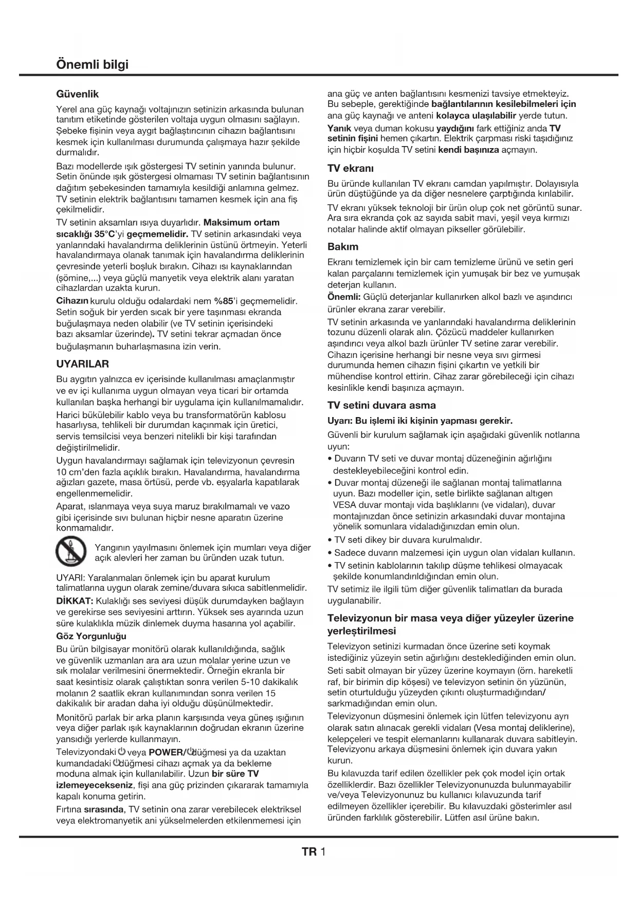 Разделы 9 прочая информация Дизайн и характеристики могут быть изменены без уведомления. дополнительные периферийные устройства или членские взносы, которые продаются отдельно. Пожалуйста, посетите наш веб-сайт для получения дополнительной информации по конкретному устройству и доступности контента. Услуги и доступность контента через SmartTV могут время от времени изменяться без предварительного уведомления. Весь контент и услуги, доступные через это устройство, принадлежат третьим лицам и защищены авторскими правами, патентами, товарными знаками и / или другими законами об интеллектуальной собственности. Такой контент и услуги предоставляются исключительно для Вашего личного некоммерческого использования. Вы не можете использовать любой контент или услуги каким-либо не разрешенным владельцем контента или поставщиком услуг образом. Без ограничения вышеизложенного, если не получено разрешение соответствующего владельца контента или услуг, вы не можете изменять, копировать, переиздавать, загружать, публиковать, передавать, переводить, продавать, создавать производные работы, продвигать или каким- либо образом распространять любой контент или услуги, полученные с помощью этого устройства.TR 1 Önemli bilgi Güvenlik Yerel ana güç kaynağı voltajınızın setinizin arkasında bulunan tanıtım etiketinde gösterilen voltaja uygun olmasını sağlayın. Șebeke fișinin veya aygıt bağlaștırıcının cihazın bağlantısını kesmek için kullanılması durumunda çalıșmaya hazır șekilde durmalıdır. Bazı modellerde ıșık göstergesi TV setinin yanında bulunur. Setin önünde ıșık göstergesi olmaması TV setinin bağlantısının dağıtım șebekesinden tamamıyla kesildiği anlamına gelmez. TV setinin elektrik bağlantısını tamamen kesmek için ana fiș çekilmelidir. TV setinin aksamları ısıya duyarlıdır. Maksimum ortam sıcaklığı 35°C’yi geçmemelidir. TV setinin arkasındaki veya yanlarındaki havalandırma deliklerinin üstünü örtmeyin. Yeterli havalandırmaya olanak tanımak için havalandırma deliklerinin çevresinde yeterli boșluk bırakın. Cihazı ısı kaynaklarından (șömine,...) veya güçlü manyetik veya elektrik alanı yaratan cihazlardan uzakta kurun. Cihazın kurulu olduğu odalardaki nem %85’i geçmemelidir. Setin soğuk bir yerden sıcak bir yere tașınması ekranda buğulașmaya neden olabilir (ve TV setinin içerisindeki bazı aksamlar üzerinde). TV setini tekrar açmadan önce buğulașmanın buharlașmasına izin verin. UYARILAR Bu aygıtın yalnızca ev içerisinde kullanılması amaçlanmıștır ve ev içi kullanıma uygun olmayan veya ticari bir ortamda kullanılan bașka herhangi bir uygulama için kullanılmamalıdır. Harici bükülebilir kablo veya bu transformatörün kablosu hasarlıysa, tehlikeli bir durumdan kaçınmak için üretici, servis temsilcisi veya benzeri nitelikli bir kiși tarafından değiștirilmelidir. Uygun havalandırmayı sağlamak için televizyonun çevresin 10 cm’den fazla açıklık bırakın. Havalandırma, havalandırma ağızları gazete, masa örtüsü, perde vb. eșyalarla kapatılarak engellenmemelidir. Aparat, ıslanmaya veya suya maruz bırakılmamalı ve vazo gibi içerisinde sıvı bulunan hiçbir nesne aparatın üzerine konmamalıdır. Yangının yayılmasını önlemek için mumları veya diğer açık alevleri her zaman bu üründen uzak tutun. UYARI: Yaralanmaları önlemek için bu aparat kurulum talimatlarına uygun olarak zemine/duvara sıkıca sabitlenmelidir. DİKKAT: Kulaklığı ses seviyesi düșük durumdayken bağlayın ve gerekirse ses seviyesini arttırın. Yüksek ses ayarında uzun süre kulaklıkla müzik dinlemek duyma hasarına yol açabilir. Göz Yorgunluğu Bu ürün bilgisayar monitörü olarak kullanıldığında, sağlık ve güvenlik uzmanları ara ara uzun molalar yerine uzun ve sık molalar verilmesini önermektedir. Örneğin ekranla bir saat kesintisiz olarak çalıștıktan sonra verilen 5-10 dakikalık molanın 2 saatlik ekran kullanımından sonra verilen 15 dakikalık bir aradan daha iyi olduğu düșünülmektedir. Monitörü parlak bir arka planın karșısında veya güneș ıșığının veya diğer parlak ıșık kaynaklarının doğrudan ekranın üzerine yansıdığı yerlerde kullanmayın. Televizyondaki veya POWER/ düğmesi ya da uzaktan kumandadaki düğmesi cihazı açmak ya da bekleme moduna almak için kullanılabilir. Uzun bir süre TV izlemeyecekseniz, fiși ana güç prizinden çıkararak tamamıyla kapalı konuma getirin. Fırtına sırasında, TV setinin ona zarar verebilecek elektriksel veya elektromanyetik ani yükselmelerden etkilenmemesi için ana güç ve anten bağlantısını kesmenizi tavsiye etmekteyiz. Bu sebeple, gerektiğinde bağlantılarının kesilebilmeleri için ana güç kaynağı ve anteni kolayca ulașılabilir yerde tutun. Yanık veya duman kokusu yaydığını fark ettiğiniz anda TV setinin fișin