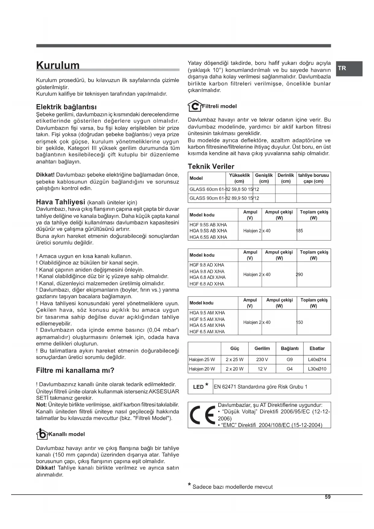 Kurulum Kurulum prosedürü, bu kılavuzun ilk sayfalarında çizimle gösterilmiştir. Kurulum kalifi ye bir teknisyen tarafından yapılmalıdır. Elektrik bağlantısı Şebeke gerilimi, davlumbazın iç kısmındaki derecelendirme etiketlerinde gösterilen değerlere uygun olmalıdır. Davlumbazın fi şi varsa, bu fi şi kolay erişilebilen bir prize takın. Fişi yoksa (doğrudan şebeke bağlantısı) veya prize erişmek çok güçse, kurulum yönetmeliklerine uygun bir şekilde, Kategori III yüksek gerilim durumunda tüm bağlantının kesilebileceği çift kutuplu bir düzenleme anahtarı bağlayın. Dikkat! Davlumbazı şebeke elektriğine bağlamadan önce, şebeke kablosunun düzgün bağlandığını ve sorunsuz çalıştığını kontrol edin. Hava Tahliyesi (kanallı üniteler için) Davlumbazı, hava çıkış fl anşının çapına eşit çapta bir duvar tahliye deliğine ve kanala bağlayın. Daha küçük çapta kanal ya da tahliye deliği kullanılması davlumbazın kapasitesini düşürür ve çalışma gürültüsünü artırır. Buna aykırı hareket etmenin doğurabileceği sonuçlardan üretici sorumlu değildir. ! Amaca uygun en kısa kanalı kullanın. ! Olabildiğince az bükülen bir kanal seçin. ! Kanal çapının aniden değişmesini önleyin. ! Kanal olabildiğince düz bir iç yüzeye sahip olmalıdır. ! Kanal, düzenleyici malzemeden üretilmiş olmalıdır. ! Davlumbazı, diğer ekipmanların (boyler, fırın vs.) yanma gazlarını taşıyan bacalara bağlamayın. ! Hava tahliyesi konusundaki yerel yönetmeliklere uyun. Çekilen hava, söz konusu açıklık bu amaca uygun bir tasarıma sahip değilse duvar açıklığından tahliye edilemeyebilir. ! Davlumbazın oda içinde emme basıncı (0,04 mbar'ı aşmamalıdır) oluşturmasını önlemek için, odada hava emme delikleri oluşturun. ! Bu talimatlara aykırı hareket etmenin doğurabileceği sonuçlardan üretici sorumlu değildir. Filtre mi kanallama mı? ! Davlumbazınız kanallı ünite olarak tedarik edilmektedir. Üniteyi fi ltreli ünite olarak kullanmak isterseniz AKSESUAR SETİ takmanız gerekir. Not: Üniteyle birlikte verilmişse, aktif karbon fi ltresi takılabilir. Kanallı üniteden fi ltreli üniteye nasıl geçileceği hakkında talimatlar bu kılavuzda mevcuttur (bkz. "Filtreli Model"). Kanallı model Davlumbaz havayı arıtır ve çıkış fl anşına bağlı bir tahliye kanalı (150 mm çapında) üzerinden dışarıya atar. Tahliye borusunun çapı, çıkış fl anşının çapına eşit olmalıdır. Dikkat! Tahliye kanalı birlikte verilmez ve ayrıca satın alınmalıdır. Yatay döşendiği takdirde, boru hafi f yukarı doğru açıyla (yaklaşık 10°) konumlandırılmalı ve bu sayede havanın dışar ıya daha kolay verilmesi sağlanmalıdır. Davlumbazla birlikte karbon filtreleri verilmişse, öncelikle bunlar çıkarılmalıdır. Filtreli model Davlumbaz havayı arıtır ve tekrar odanın içine verir. Bu davlumbaz modelinde, yardımcı bir aktif karbon fi ltresi ünitesinin takılması gereklidir. Bu modelde ayrıca deflektöre, azaltım adaptörüne ve karbon fi ltresine/fi ltrelerine ihtiyaç duyulur. Üst boru, en üst kısımda kendine ait hava çıkış yuvalarına sahip olmalıdır. Teknik Veriler ModelYükseklik (cm) Genişlik (cm) Derinlik (cm) tahliye borusu çapı (cm)GLASS 60cm 61-82 59,8 50 15/12GLASS 90cm 61-82 89,9 50 15/12Model koduAmpul (V) Ampul çekişi (W) Toplam çekiş (W) HGF 9.5S AB X/HAHGA 9.5S AB X/HAHGA 6.5S AB X/HAHalojen 2 x 40 185Model koduAmpul (V) Ampul çekişi (W) Toplam çekiş (W) HGF 9.8 AD X/HAHGA 9.8 AD X/HAHGA 6.8 ADI X/HAHGF 6.8 AD X/HAHalojen 2 x 40 290Model koduAmpul (V) Ampul çekişi (W) Toplam çekiş (W) HGA 9.5 AM X/HAHGF 9.5 AM X/HAHGA 6.5 AM X/HAHGF 6.5 AM X/HAHalojen 2 x 40 150 Güç Gerilim Bağlantı Ebatlar Halojen 25 W 2 x 25 W 230 V G9 L40xØ14 Halojen 20 W 2 x 20 W 12 V G4 L30xØ10 LED *EN 62471 Standardına göre Risk Grubu 1 Davlumbazlar, şu AT Direktifl erine uygundur: