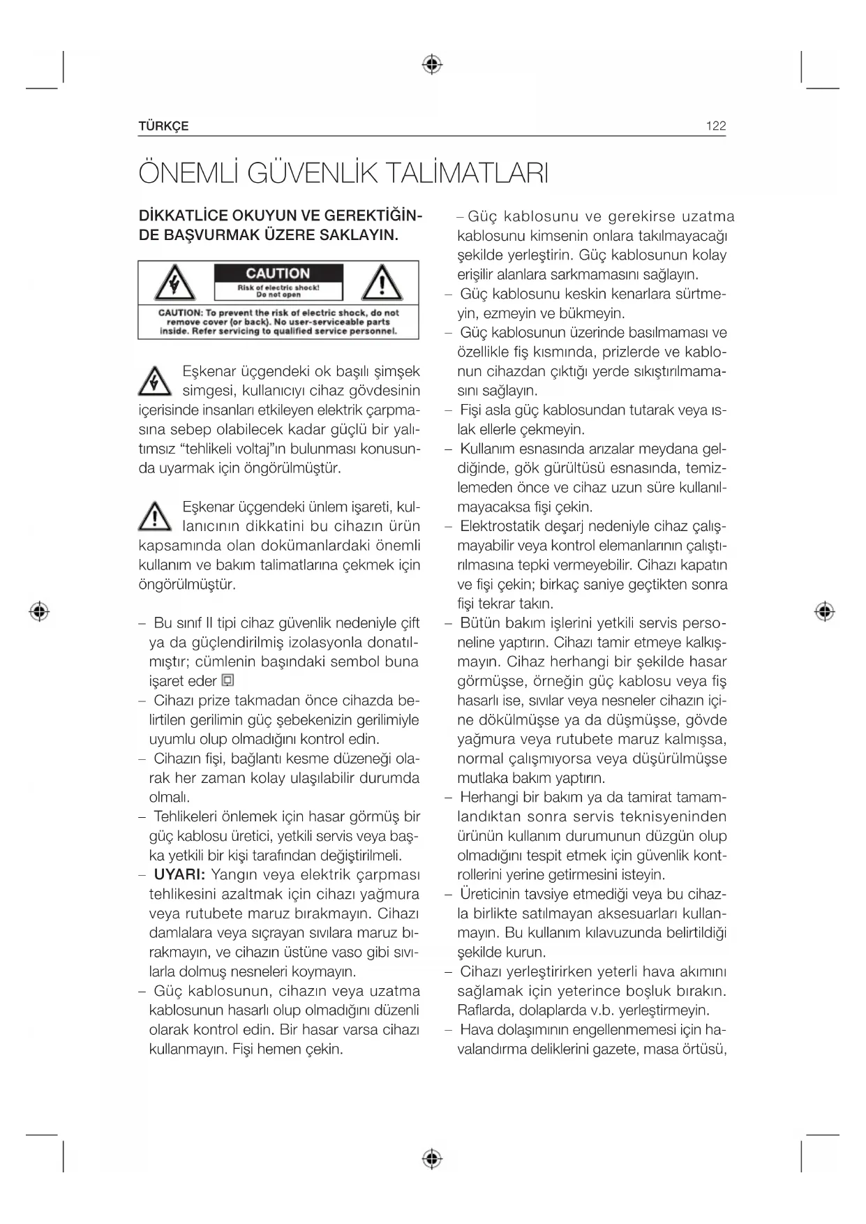 Eşkenar üçgendeki ok başılı şimşek simgesi, kullanıcıyı cihaz gövdesinin içerisinde insanları etkileyen elektrik çarpma- sına sebep olabilecek kadar güçlü bir yalı- tımsız “tehlikeli voltaj”ın bulunması konusun- da uyarmak için öngörülmüştür. Eşkenar üçgendeki ünlem işareti, kul- lanıcının dikkatini bu cihazın ürün kapsamında olan dokümanlardaki önemli kullanım ve bakım talimatlarına çekmek için öngörülmüştür. – Bu sınıf II tipi cihaz güvenlik nedeniyle çift ya da güçlendirilmiş izolasyonla donatıl- mıştır; cümlenin başındaki sembol buna işaret eder . – Cihazı prize takmadan önce cihazda be- lirtilen gerilimin güç şebekenizin gerilimiyle uyumlu olup olmadığını kontrol edin. – Cihazın fişi, bağlantı kesme düzeneği ola- rak her zaman kolay ulaşılabilir durumda olmalı. – Tehlikeleri önlemek için hasar görmüş bir güç kablosu üretici, yetkili servis veya baş- ka yetkili bir kişi tarafından değiştirilmeli. – UYARI: Yangın veya elektrik çarpması tehlikesini azaltmak için cihazı yağmura veya rutubete maruz bırakmayın. Cihazı damlalara veya sıçrayan sıvılara maruz bı- rakmayın, ve cihazın üstüne vaso gibi sıvı- larla dolmuş nesneleri koymayın. – Güç kablosunun, cihazın veya uzatma kablosunun hasarlı olup olmadığını düzenli olarak kontrol edin. Bir hasar varsa cihazı kullanmayın. Fişi hemen çekin.