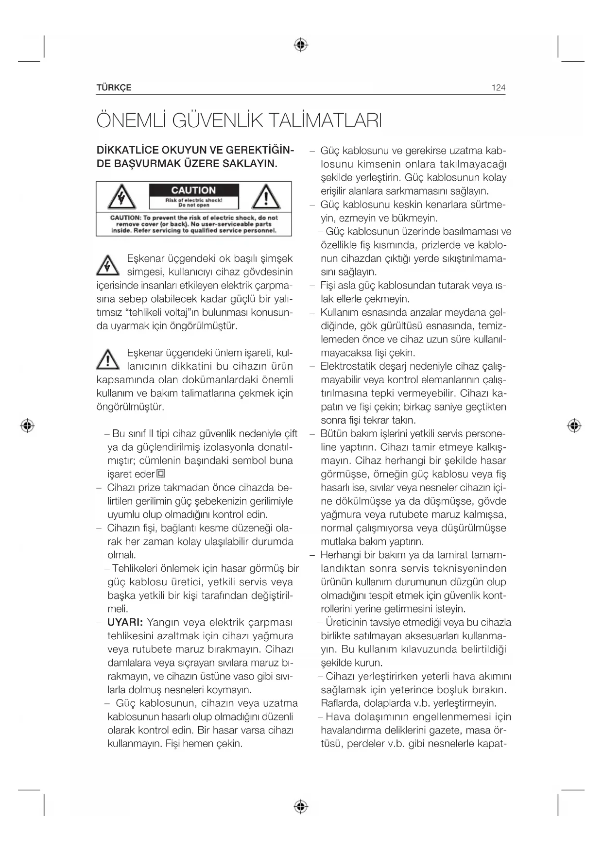 Eşkenar üçgendeki ok başılı şimşek simgesi, kullanıcıyı cihaz gövdesinin içerisinde insanları etkileyen elektrik çarpma- sına sebep olabilecek kadar güçlü bir yalı- tımsız “tehlikeli voltaj”ın bulunması konusun- da uyarmak için öngörülmüştür. Eşkenar üçgendeki ünlem işareti, kul- lanıcının dikkatini bu cihazın ürün kapsamında olan dokümanlardaki önemli kullanım ve bakım talimatlarına çekmek için öngörülmüştür. – Bu sınıf II tipi cihaz güvenlik nedeniyle çift ya da güçlendirilmiş izolasyonla donatıl- mıştır; cümlenin başındaki sembol buna işaret eder . – Cihazı prize takmadan önce cihazda be- lirtilen gerilimin güç şebekenizin gerilimiyle uyumlu olup olmadığını kontrol edin. – Cihazın fişi, bağlantı kesme düzeneği ola- rak her zaman kolay ulaşılabilir durumda olmalı. – Tehlikeleri önlemek için hasar görmüş bir güç kablosu üretici, yetkili servis veya başka yetkili bir kişi tarafından değiştiril- meli. – UYARI: Yangın veya elektrik çarpması tehlikesini azaltmak için cihazı yağmura veya rutubete maruz bırakmayın. Cihazı damlalara veya sıçrayan sıvılara maruz bı- rakmayın, ve cihazın üstüne vaso gibi sıvı- larla dolmuş nesneleri koymayın. – Güç kablosunun, cihazın veya uzatma kablosunun hasarlı olup olmadığını düzenli olarak kontrol edin. Bir hasar varsa cihazı kullanmayın. Fişi hemen çekin.