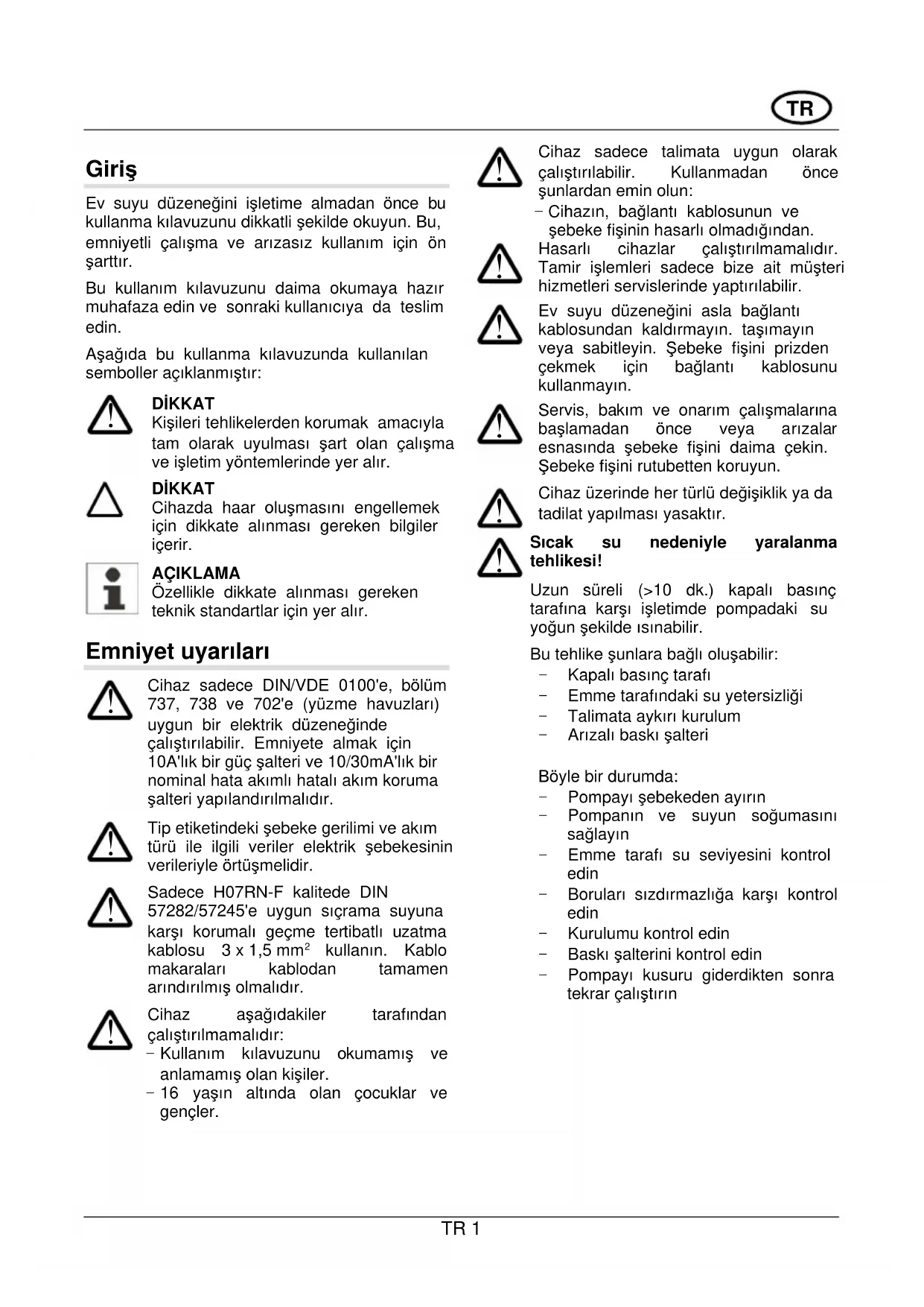 Giriş Ev suyu düzeneğini işletime almadan önce bu kullanma kılavuzunu dikkatli şekilde okuyun. Bu, emniyetli çalışma ve arızasız kullanım için ön şarttır. Bu kullanım kılavuzunu daima okumaya hazır muhafaza edin ve sonraki kullanıcıya da teslim edin. Aşağıda bu kullanma kılavuzunda kullanılan semboller açıklanmıştır: