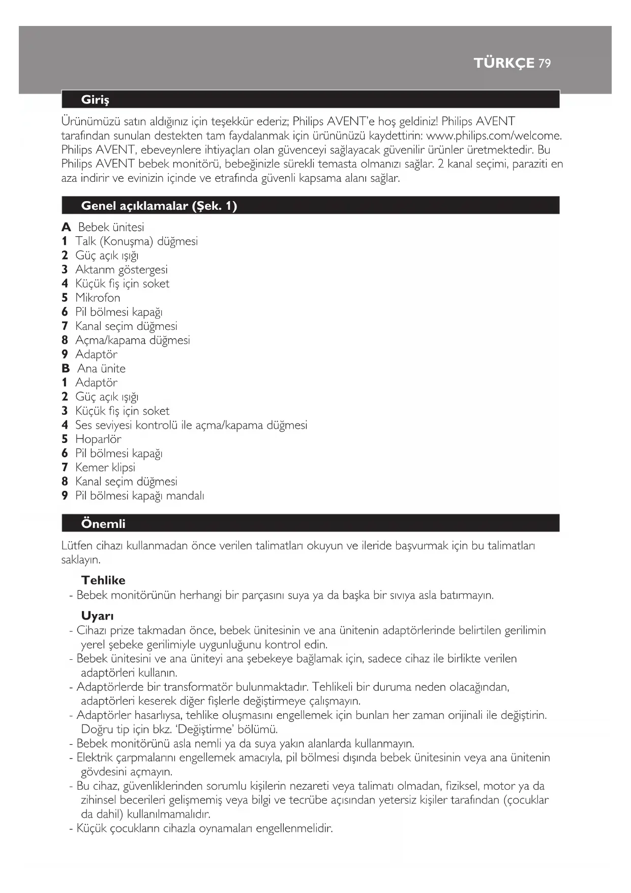 - Elektrik çarpmalarını engellemek amacıyla, pil bölmesi dışında bebek ünitesinin veya ana ünitenin
