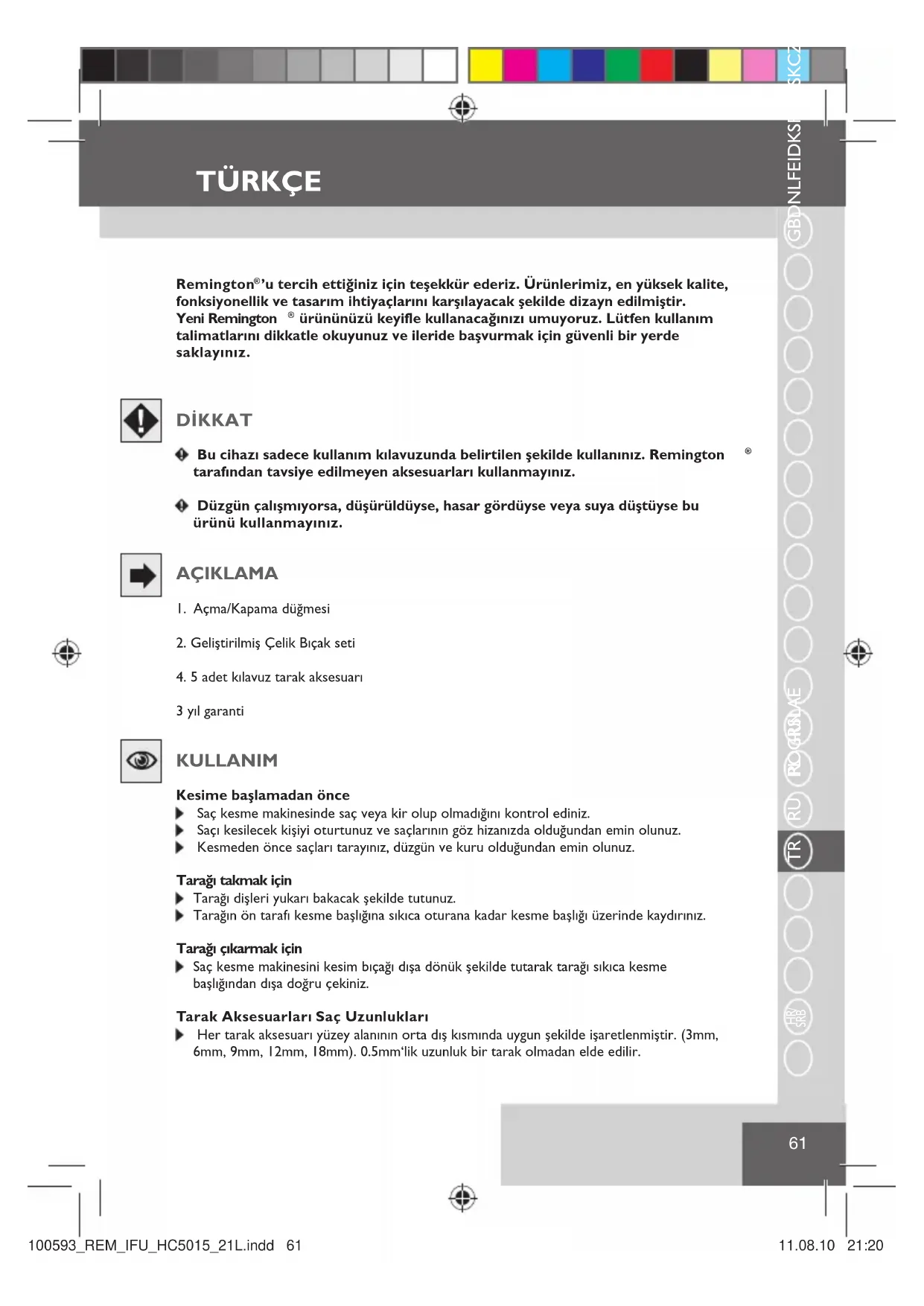SRB TR Remington ® ’u tercih ettiğiniz için teşekkür ederiz. Ürünlerimiz, en yüksek kalite, fonksiyonellik ve tasarım ihtiyaçlarını karşılayacak şekilde dizayn edilmiştir. Yeni Remington ® ürününüzü keyifle kullanacağınızı umuyoruz. Lütfen kullanım talimatlarını dikkatle okuyunuz ve ileride başvurmak için güvenli bir yerde saklayınız.