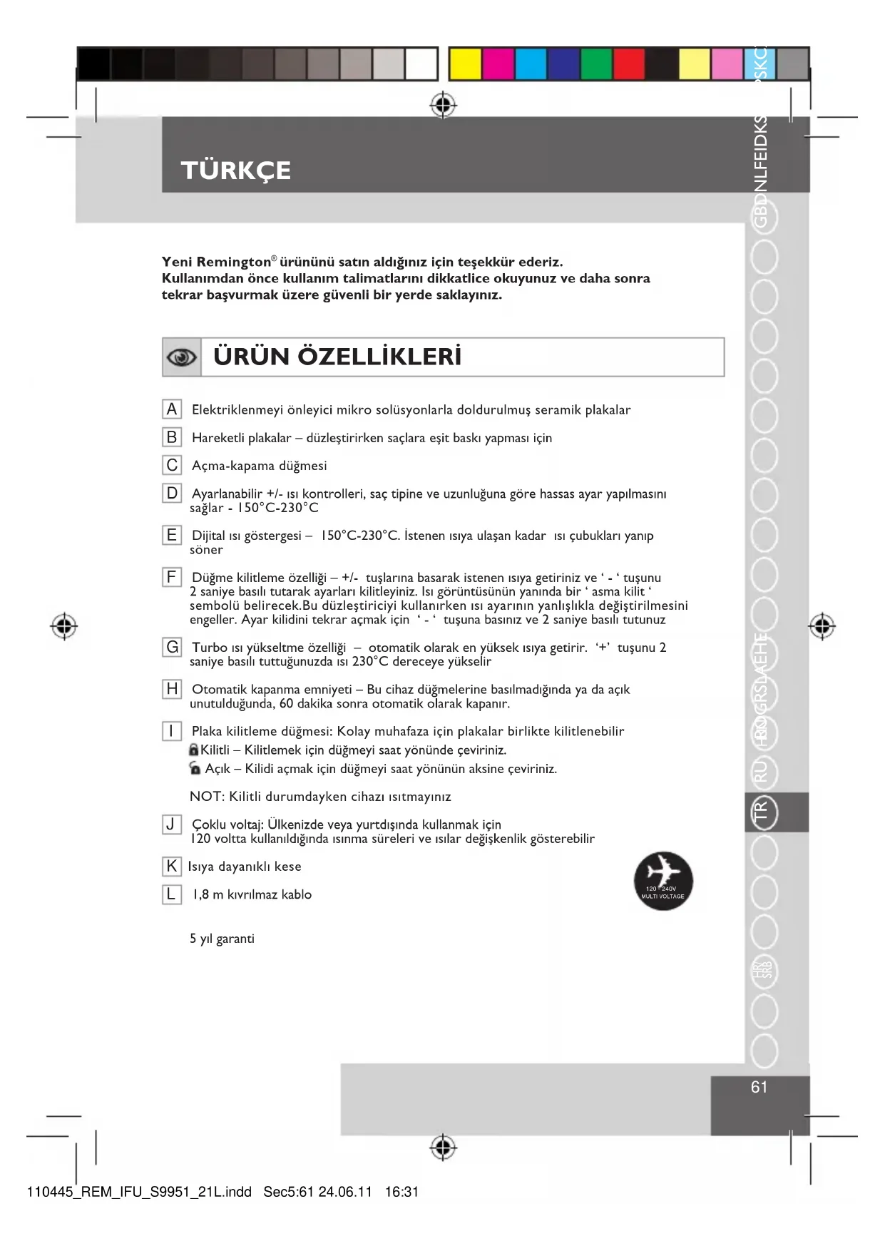 A Elektriklenmeyi önleyici mikro solüsyonlarla doldurulmuş seramik plakalar B Hareketli plakalar – düzleştirirken saçlara eşit baskı yapması için C Açma-kapama düğmesi D Ayarlanabilir +/- ısı kontrolleri, saç tipine ve uzunluğuna göre hassas ayar yapılmasını sağlar - 150°C-230°C E Dijital ısı göstergesi – 150°C-230°C. İstenen ısıya ulaşan kadar ısı çubukları yanıp söner F Düğme kilitleme özelliği – +/- tuşlarına basarak istenen ısıya getiriniz ve ‘ - ‘ tuşunu 2 saniye basılı tutarak ayarları kilitleyiniz. Isı görüntüsünün yanında bir ‘ asma kilit ‘ sembolü belirecek.Bu düzleştiriciyi kullanırken ısı ayarının yanlışlıkla değiştirilmesini engeller. Ayar kilidini tekrar açmak için ‘ - ‘ tuşuna basınız ve 2 saniye basılı tutunuz G Turbo ısı yükseltme özelliği – otomatik olarak en yüksek ısıya getirir. ‘+’ tuşunu 2 saniye basılı tuttuğunuzda ısı 230°C dereceye yükselir H Otomatik kapanma emniyeti – Bu cihaz düğmelerine basılmadığında ya da açık unutulduğunda, 60 dakika sonra otomatik olarak kapanır. I Plaka kilitleme düğmesi: Kolay muhafaza için plakalar birlikte kilitlenebilir Kilitli – Kilitlemek için düğmeyi saat yönünde çeviriniz. Açık – Kilidi açmak için düğmeyi saat yönünün aksine çeviriniz.NOT: Kilitli durumdayken cihazı ısıtmayınız J Çoklu voltaj: Ülkenizde veya yurtdışında kullanmak için120 voltta kullanıldığında ısınma süreleri ve ısılar değişkenlik gösterebilir K Isıya dayanıklı kese L 1,8 m kıvrılmaz kablo5 yıl garanti TÜRKÇE 120 - 240VMULTI VOLTAGE110445_REM_IFU_S9951_21L.indd Sec5:61 24.06.11 16:3162