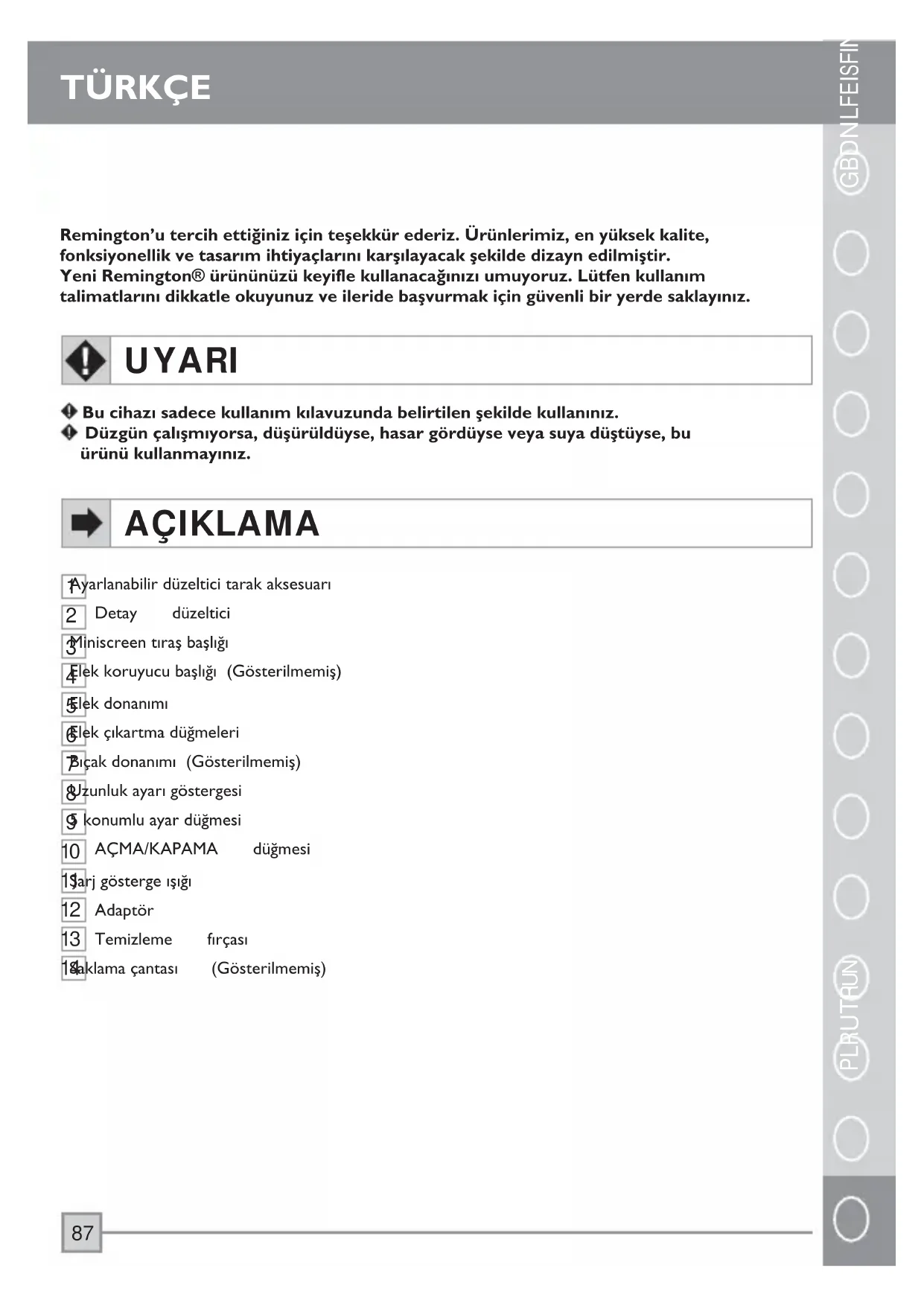 Sadece cihazla birlikte verilen parçaları kullanınız. Remington‘a ait olmayan parçaların bu ürünle birlikte