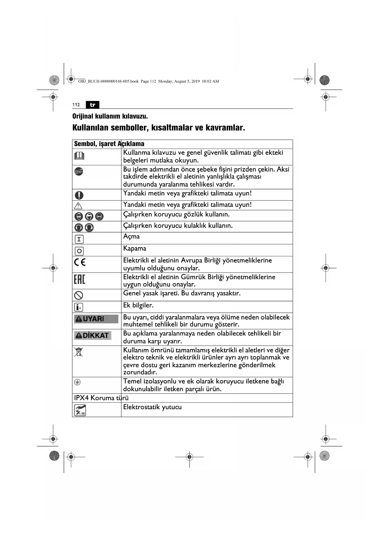 Orijinal kullanım kılavuzu. Kullanılan semboller, kısaltmalar ve kavramlar. Sembol, işaret Açıklama Kullanma kılavuzu ve genel güvenlik talimatı gibi ekteki belgeleri mutlaka okuyun. Bu işlem adımından önce şebeke fişini prizden çekin. Aksi takdirde elektrikli el aletinin yanlışlıkla çalışması durumunda yaralanma tehlikesi vardır. Yandaki metin veya grafikteki talimata uyun! Yandaki metin veya grafikteki talimata uyun! Çalışırken koruyucu gözlük kullanın. Çalışırken koruyucu kulaklık kullanın. Açma Kapama Elektrikli el aletinin Avrupa Birliği yönetmeliklerine uyumlu olduğunu onaylar. Elektrikli el aletinin Gümrük Birliği yönetmeliklerine uygun olduğunu onaylar. Genel yasak işareti. Bu davranış yasaktır. Ek bilgiler. Bu uyarı, ciddi yaralanmalara veya ölüme neden olabilecek muhtemel tehlikeli bir durumu gösterir. Bu açıklama yaralanmaya neden olabilecek tehlikeli bir duruma karşı uyarır. Kullanım ömrünü tamamlamış elektrikli el aletleri ve diğer elektro teknik ve elektrikli ürünler ayrı ayrı toplanmak ve çevre dostu geri kazanım merkezlerine gönderilmek zorundadır. Temel izolasyonlu ve ek olarak koruyucu iletkene bağlı dokunulabilir iletken parçalı ürün. IPX4 Koruma türü Elektrostatik yutucu OBJ_BUCH-0000000148-005.book Page 112 Monday, August 5, 2019 10:02 AM113