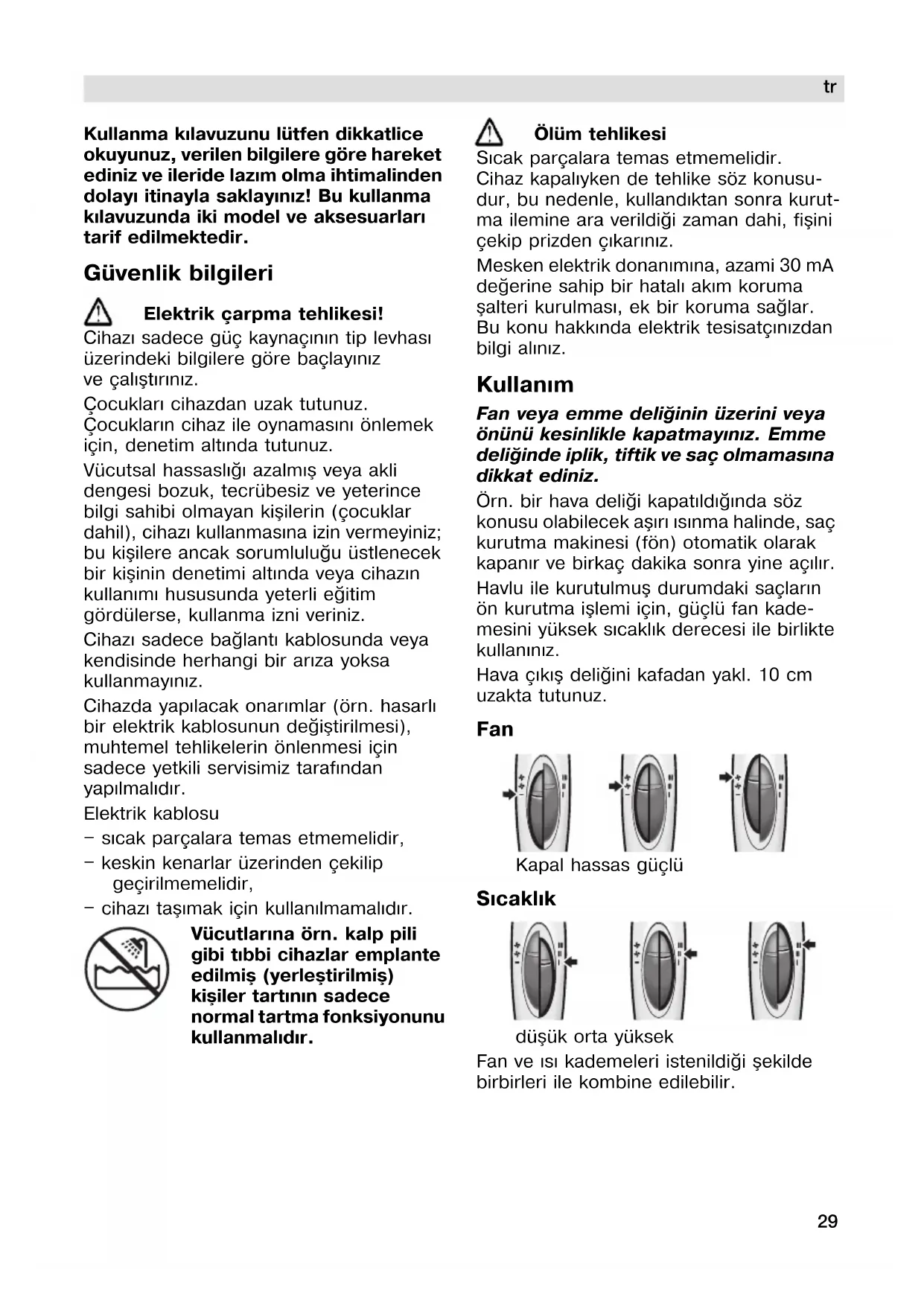 Kullanma kýlavuzunu lütfen dikkatlice okuyunuz, verilen bilgilere göre hareket ediniz ve ileride lazým olma ihtimalinden dolayý itinayla saklayýnýz! Bu kullanma kýlavuzunda iki model ve aksesuarlarý tarif edilmektedir. Güvenlik bilgileri Elektrik çarpma tehlikesi! Cihazý sadece güç kaynaçýnýn tip levhasý üzerindeki bilgilere göre baçlayýnýz ve çalýþtýrýnýz. Çocuklarý cihazdan uzak tutunuz. Çocuklarýn cihaz ile oynamasýný önlemek için, denetim altýnda tutunuz. Vücutsal hassaslýðý azalmýþ veya akli dengesi bozuk, tecrübesiz ve yeterince bilgi sahibi olmayan kiþilerin (çocuklar dahil), cihazý kullanmasýna izin vermeyiniz; bu kiþilere ancak sorumluluðu üstlenecek bir kiþinin denetimi altýnda veya cihazýn kullanýmý hususunda yeterli eðitim gördülerse, kullanma izni veriniz. Cihazý sadece baðlantý kablosunda veya kendisinde herhangi bir arýza yoksa kullanmayýnýz. Cihazda yapýlacak onarýmlar (örn. hasarlý bir elektrik kablosunun deðiþtirilmesi), muhtemel tehlikelerin önlenmesi için sadece yetkili servisimiz tarafýndan yapýlmalýdýr. Elektrik kablosu — sýcak parçalara temas etmemelidir, — keskin kenarlar üzerinden çekilip geçirilmemelidir, — cihazý taþýmak için kullanýlmamalýdýr. Vücutlarýna örn. kalp pili gibi týbbi cihazlar emplante edilmiþ (yerleþtirilmiþ) kiþiler tartýnýn sadece normal tartma fonksiyonunu kullanmalýdýr. Ölüm tehlikesi Sýcak parçalara temas etmemelidir. Cihaz kapalýyken de tehlike söz konusu- dur, bu nedenle, kullandýktan sonra kurut- ma ilemine ara verildiði zaman dahi, fiþini çekip prizden çýkarýnýz. Mesken elektrik donanýmýna, azami 30 mA deðerine sahip bir hatalý akým koruma þalteri kurulmasý, ek bir koruma saðlar. Bu konu hakkýnda elektrik tesisatçýnýzdan bilgi alýnýz. Kullaným Fan veya emme deliðinin üzerini veya önünü kesinlikle kapatmayýnýz. Emme deliðinde iplik, tiftik ve saç olmamasýna dikkat ediniz. Örn. bir hava deliði kapatýldýðýnda söz konusu olabilecek aþýrý ýsýnma halinde, saç kurutma makinesi (fön) otomatik olarak kapanýr ve birkaç dakika sonra yine açýlýr. Havlu ile kurutulmuþ durumdaki saçlarýn ön kurutma iþlemi için, güçlü fan kade- mesini yüksek sýcaklýk derecesi ile birlikte kullanýnýz. Hava çýkýþ deliðini kafadan yakl. 10 cm uzakta tutunuz. Fan Kapal hassas güçlü Sýcaklýk düþük orta yüksek Fan ve ýsý kademeleri istenildiði þekilde birbirleri ile kombine edilebilir.íê