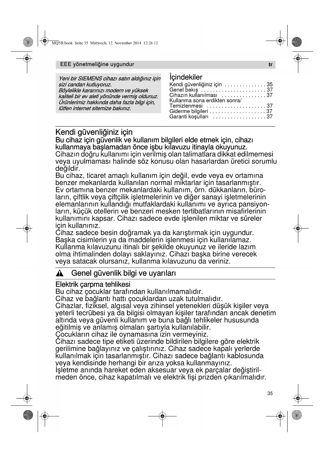 İçindekiler Kendi güvenliğiniz için . . . . . . . . . . . . . . 35Genel bakış . . . . . . . . . . . . . . . . . . . . . . 37Cihazın kullanılması . . . . . . . . . . . . . . . 37Kullanma sona erdikten sonra/Temizlenmesi . . . . . . . . . . . . . . . . . . . . 37Giderme bilgileri . . . . . . . . . . . . . . . . . . . 37Garanti koşulları . . . . . . . . . . . . . . . . . . 37 Kendi güvenliğiniz için