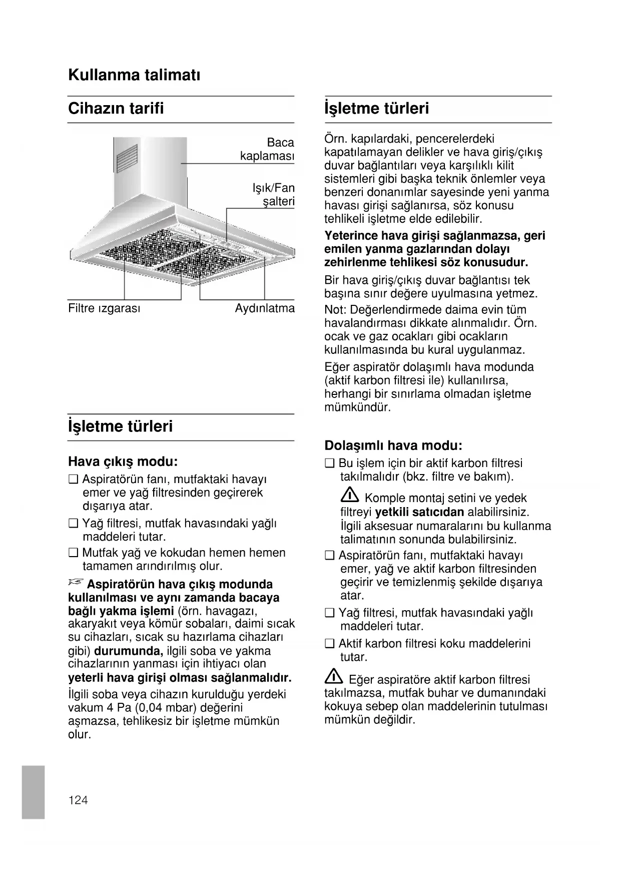 Cihaz∂n baπlant∂s∂ ve iµletmeye al∂nmas∂ sadece yetkili bir elemantaraf∂ndan yap∂lmal∂d∂r. Eπer bu cihaz∂n baπlant∂ hatt∂ zarar görürse, herhangi bir tehlike oluµmas∂n∂önlemek için, bu hat cihaz üreticisi veyayetkili servis taraf∂ndan ya da ayn∂ yetki veolanaklara sahip baµka bir uzman elemantaraf∂ndan deπiµtirilmelidir. Cihaz∂n ambalaj malzemesi gerektiπi µekilde giderilmelidir (montaj talimat∂nabak∂n∂z). Bu aspiratör ticari kullan∂m için deπil, evde kullan∂lmak için üretilmiµtir. Aspiratörü ancak lambalar∂ (ampulleri) tak∂l∂ µekilde çal∂µt∂r∂n∂z. Bozuk ampuller, çal∂µ∂r durumdaki diπer ampullerin aµ∂r∂ yüklenmesininönlenmesi için derhal deπiµtirilmelidir. Aspiratör hiçbir zaman yaπ filtresi olmadan çal∂µt∂r∂lmamal∂d∂r. Aµ∂r∂ ∂s∂nan kat∂ veya s∂v∂ yaπlar çok çabuk alevlenebilir. Bunun için, örn. patates k∂zartmas∂ gibikat∂ ve s∂v∂ yaπlar ile besin haz∂rlarkenocaπ∂n baµ∂ndan ayr∂lmay∂n∂z. Aspiratörün alt∂nda alevlenen besinler haz∂rlamay∂n∂z.Yükselen alevlerden dolay∂ yaπ filtresinin yanma tehlikesi söz ! konusudur.126