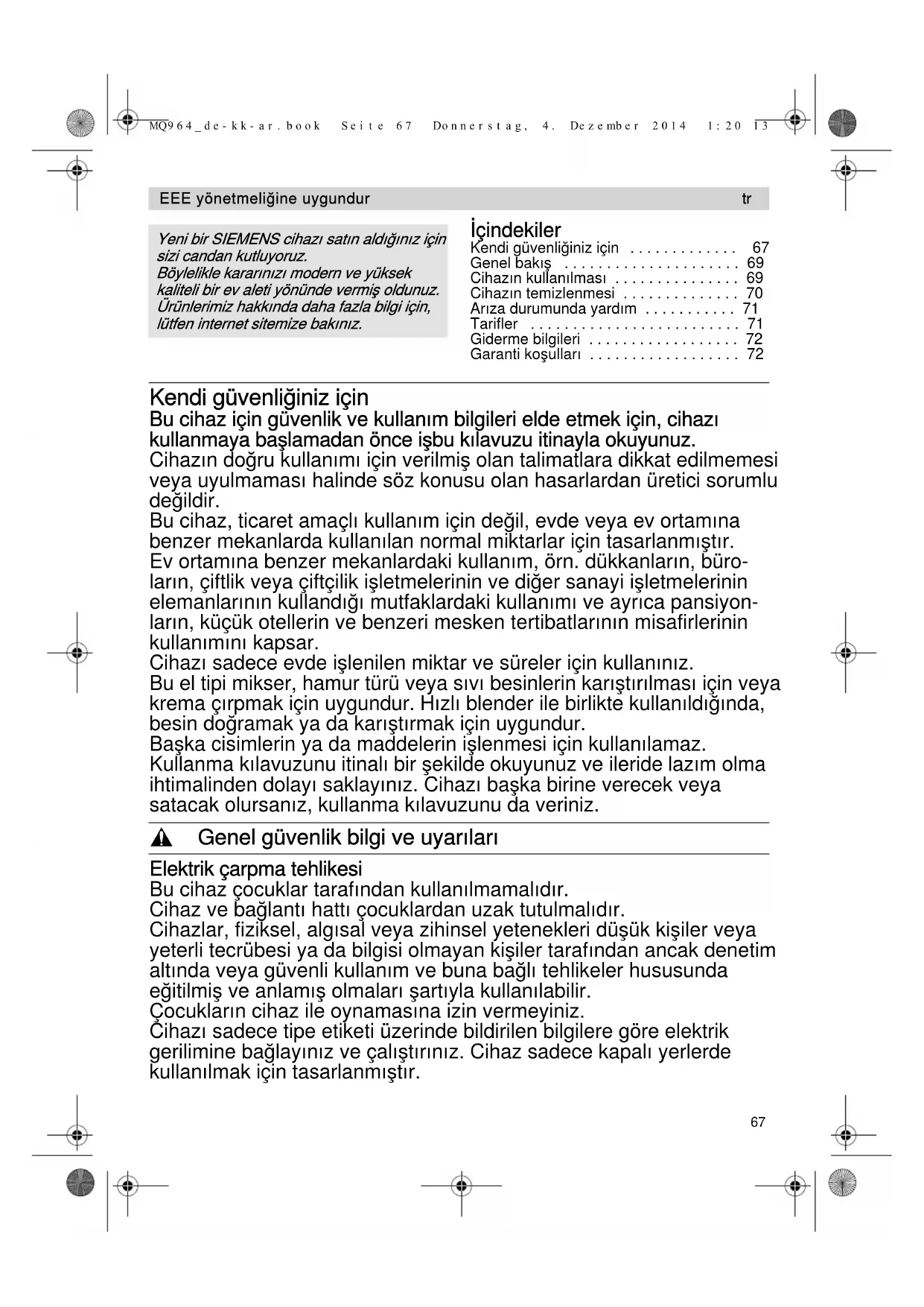 Еendi güvenliğiniz için . . . . . . . . . . . . . 67 Genel bakı . . . . . . . . . . . . . . . . . . . . . 69Cihazın kullanılзası . . . . . . . . . . . . . . . 69Cihazın teзizlenзesi . . . . . . . . . . . . . . 70Arıza duruзunda уardıз . . . . . . . . . . . 71Tarifler . . . . . . . . . . . . . . . . . . . . . . . . . 71Giderзe bilgileri . . . . . . . . . . . . . . . . . . 72Garanti koulları . . . . . . . . . . . . . . . . . . 72 Еendi güvenliğiniz için