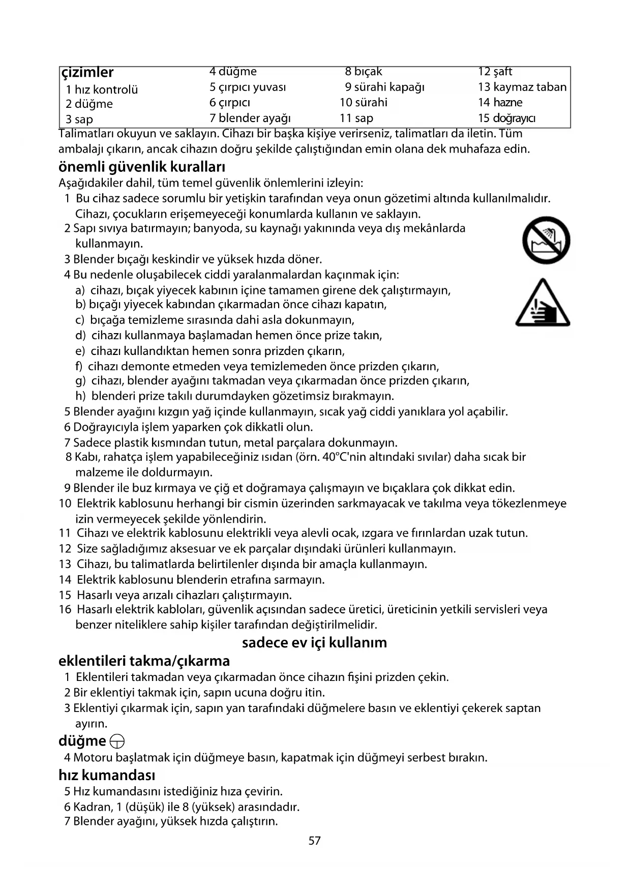 15 Blender ayağı, kaynama noktasına yakın ısılara dayanabilir. Cihazı sıcak sıvılarda kullanırken,