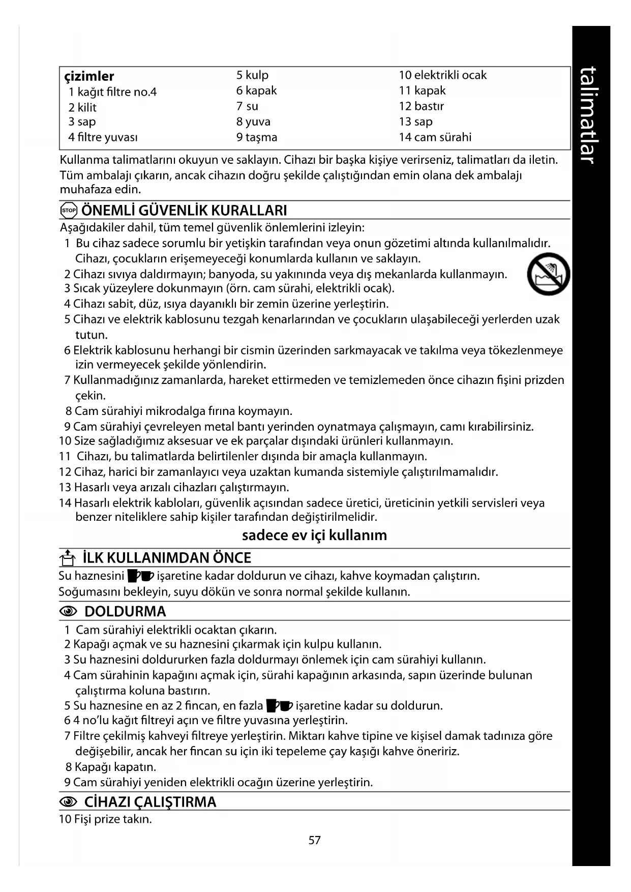 9 Cam sürahiyi çevreleyen metal bantı yerinden oynatmaya çalışmayın, camı kırabilirsiniz.