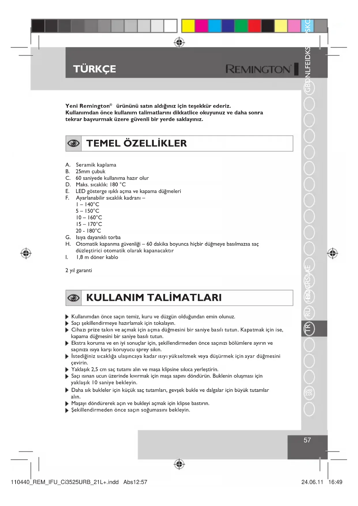 SRB TR Yeni Remington ® ürününü satın aldığınız için teşekkür ederiz.Kullanımdan önce kullanım talimatlarını dikkatlice okuyunuz ve daha sonra tekrar başvurmak üzere güvenli bir yerde saklayınız. TEMEL ÖZELLİKLER A. Seramik kaplamaB. 25mm çubukC. 60 saniyede kullanıma hazır olurD. Maks. sıcaklık: 180 °CE. LED gösterge ışıklı açma ve kapama düğmeleriF. Ayarlanabilir sıcaklık kadranı –1 – 140°C5 – 150°C10 – 160°C15 – 170°C20 - 180°CG. Isıya dayanıklı torbaH. Otomatik kapanma güvenliği – 60 dakika boyunca hiçbir düğmeye basılmazsa saç düzleştirici otomatik olarak kapanacaktırI. 1,8 m döner kablo2 yıl garanti KULLANIM TALİMATLARI Kullanımdan önce saçın temiz, kuru ve düzgün olduğundan emin olunuz. Saçı şekillendirmeye hazırlamak için tokalayın. Cihazı prize takın ve açmak için açma düğmesini bir saniye basılı tutun. Kapatmak için ise, kapama düğmesini bir saniye basılı tutun. Ekstra koruma ve en iyi sonuçlar için, şekillendirmeden önce saçınızı bölümlere ayırın ve saçınıza ısıya karşı koruyucu sprey sıkın. İstediğiniz sıcaklığa ulaşıncaya kadar ısıyı yükseltmek veya düşürmek için ayar düğmesini çevirin. Yaklaşık 2,5 cm saç tutamı alın ve maşa klipsine sıkıca yerleştirin. Saçı ısınan ucun üzerinde kıvırmak için maşa sapını döndürün. Buklenin oluşması için yaklaşık 10 saniye bekleyin. Daha sık bukleler için küçük saç tutamları, gevşek bukle ve dalgalar için büyük tutamlar alın. Maşayı döndürerek açın ve bukleyi açmak için klipse bastırın. Şekillendirmeden önce saçın soğumasını bekleyin.110440_REM_IFU_Ci3525URB_21L+.indd Abs12:57 24.06.11 16:49TÜRKÇE