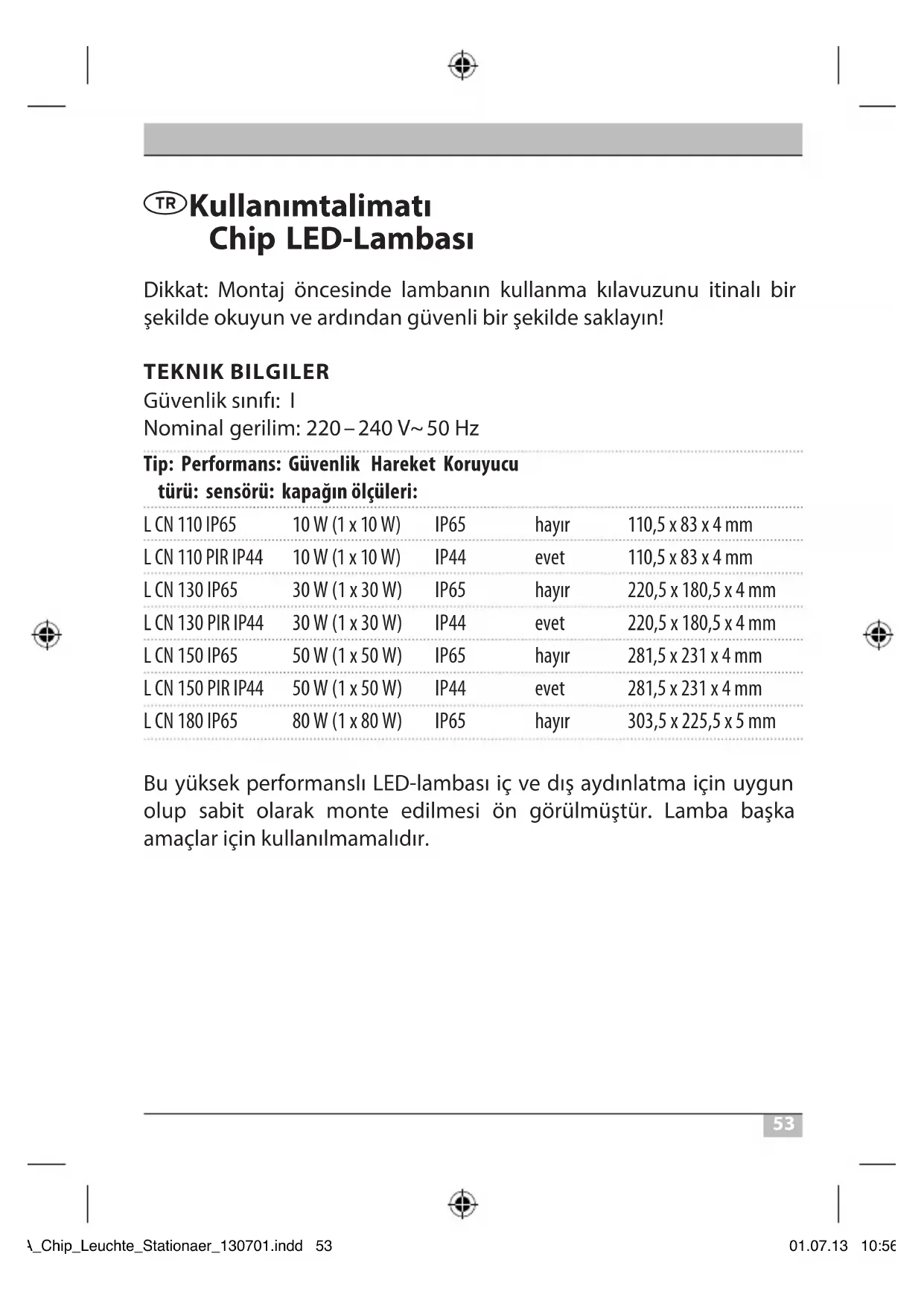 Kullanım talimatı Chip LED-Lambası Dikkat: Montaj öncesinde lambanın kullanma kılavuzunu itinalı bir şekilde okuyun ve ardından güvenli bir şekilde saklayın! TEKNIK BILGILER Güvenlik sınıfı: I Nominal gerilim: 220 – 240V~ 50Hz Tip: Performans: Güvenlik Hareket Koruyucu türü: sensörü: kapağın ölçüleri: L CN 110 IP65 10W (1 x 10W) IP65 hayır 110,5 x 83 x 4mm L CN 110 PIR IP44 10W (1 x 10W) IP44 evet 110,5 x 83 x 4mm L CN 130 IP65 30W (1 x 30W) IP65 hayır 220,5 x 180,5 x 4mm L CN 130 PIR IP44 30W (1 x 30W) IP44 evet 220,5 x 180,5 x 4mm L CN 150 IP65 50W (1 x 50W) IP65 hayır 281,5 x 231 x 4mm L CN 150 PIR IP44 50W (1 x 50W) IP44 evet 281,5 x 231 x 4mm L CN 180 IP65 80W (1 x 80W) IP65 hayır 303,5 x 225,5 x 5mm Bu yüksek performanslı LED-lambası iç ve dış aydınlatma için uygun olup sabit olarak monte edilmesi ön görülmüştür. Lamba başka amaçlar için kullanılmamalıdır. BA_Chip_Leuchte_Stationaer_130701.indd 53 01.07.13 10:5654