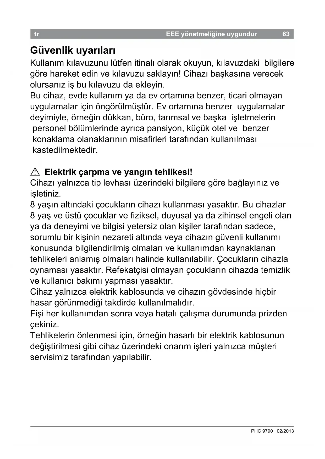 νται κατά τη διάρκεια της εγγύησης επι- στρέφονται στο συνεργείο. Με επιφύλαξη για τις όποιες αλλαγές. Τεχνικά χαρακτηριστικά Ηλεκτρική σύνδεση (τάση / συχνότητα) 220 – 240 V 50 / 60 Hz Απορροφούμενη ισχύς 88 W63 PHC 9790 02/2013 63tr EEE yönetmeliğine uygundur Güvenlik uyarıları Kullanım kılavuzunu lütfen itinalı olarak okuyun, kılavuzdaki bilgilere göre hareket edin ve kılavuzu saklayın! Cihazı başkasına verecek olursanız iş bu kılavuzu da ekleyin. Bu cihaz, evde kullanım ya da ev ortamına benzer, ticari olmayan uygulamalar için öngörülmüştür. Ev ortamına benzer uygulamalar deyimiyle, örneğin dükkan, büro, tarımsal ve başka işletmelerin personel bölümlerinde ayrıca pansiyon, küçük otel ve benzer konaklama olanaklarının misarleri tarafından kullanılması kastedilmektedir.