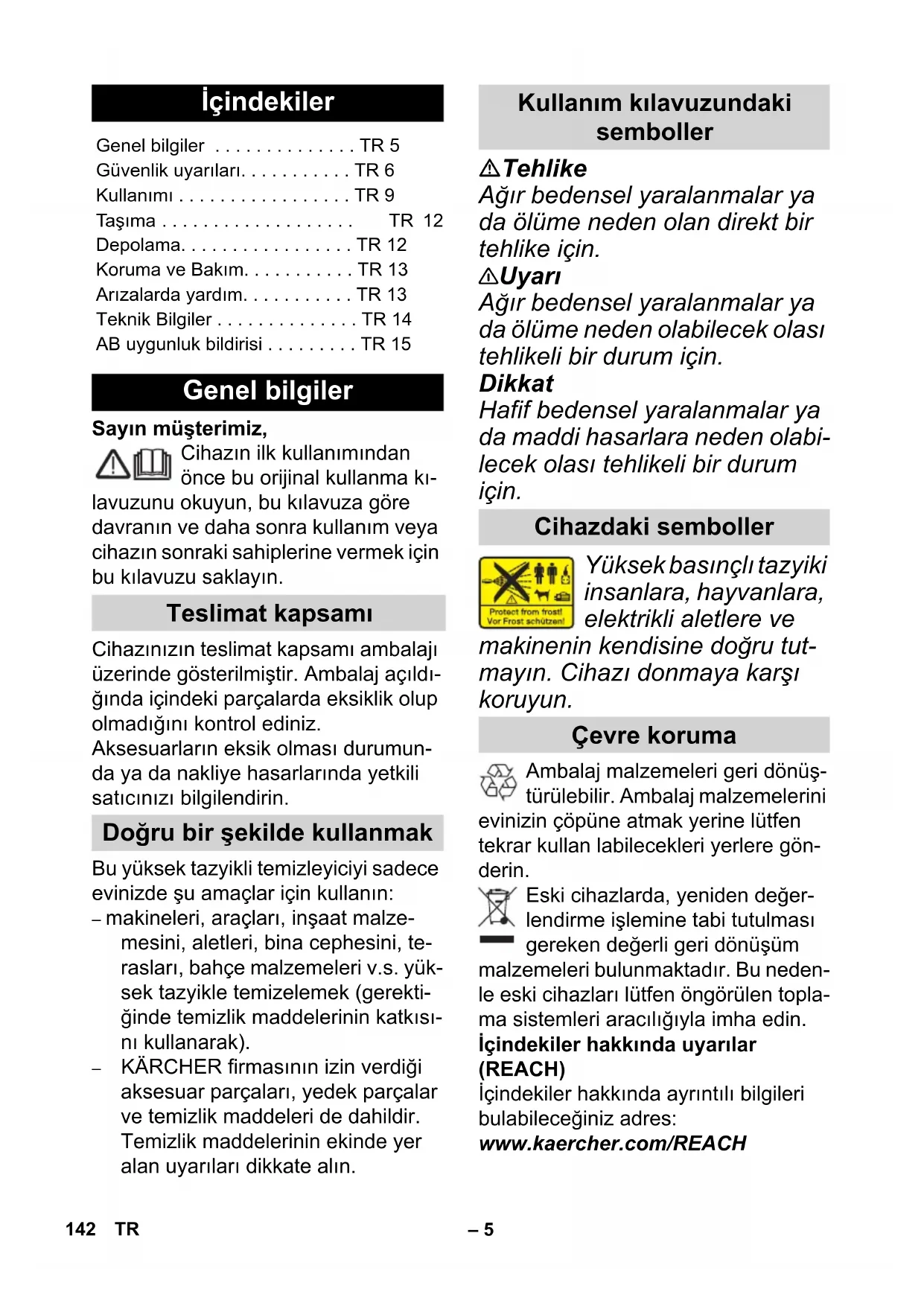 2000/14/EΚ: Παράρτημα V στάθμη ηχητικής πίεσης dB(A) Μετρημένη:87 Εγγυημένη: 90 Winnenden, 2013/07/01 CEO Head of Approbation 141EL– 5 Sayın müşterimiz, Cihazın ilk kullanımından önce bu orijinal kullanma kı- lavuzunu okuyun, bu kılavuza göre davranın ve daha sonra kullanım veya cihazın sonraki sahiplerine vermek için bu kılavuzu saklayın. Cihazınızın teslimat kapsamı ambalajı üzerinde gösterilmiştir. Ambalaj açıldı- ğında içindeki parçalarda eksiklik olup olmadığını kontrol ediniz. Aksesuarların eksik olması durumun- da ya da nakliye hasarlarında yetkili satıcınızı bilgilendirin. Bu yüksek tazyikli temizleyiciyi sadece evinizde şu amaçlar için kullanın: – makineleri, araçları, inşaat malze- mesini, aletleri, bina cephesini, te- rasları, bahçe malzemeleri v.s. yük- sek tazyikle temizelemek (gerekti- ğinde temizlik maddelerinin katkısı- nı kullanarak). – KÄRCHER firmasının izin verdiği aksesuar parçaları, yedek parçalar ve temizlik maddeleri de dahildir. Temizlik maddelerinin ekinde yer alan uyarıları dikkate alın. Tehlike Ağır bedensel yaralanmalar ya da ölüme neden olan direkt bir tehlike için. 몇 Uyarı Ağır bedensel yaralanmalar ya da ölüme neden olabilecek olası tehlikeli bir durum için. Dikkat Hafif bedensel yaralanmalar ya da maddi hasarlara neden olabi- lecek olası tehlikeli bir durum için. Yüksek basınçlı tazyiki insanlara, hayvanlara, elektrikli aletlere ve makinenin kendisine doğru tut- mayın. Cihazı donmaya karşı koruyun. Ambalaj malzemeleri geri dönüş- türülebilir. Ambalaj malzemelerini evinizin çöpüne atmak yerine lütfen tekrar kullan labilecekleri yerlere gön- derin. Eski cihazlarda, yeniden değer- lendirme işlemine tabi tutulması gereken değerli geri dönüşüm malzemeleri bulunmaktadır. Bu neden- le eski cihazları lütfen öngörülen topla- ma sistemleri aracılığıyla imha edin. İçindekiler hakkında uyarılar (REACH) İçindekiler hakkında ayrıntılı bilgileri bulabileceğiniz adres: www.kaercher.com/REACH İçindekiler Genel bilgiler . . . . . . . . . . . . . . TR 5 Güvenlik uyarıları . . . . . . . . . . . TR 6 Kullanımı . . . . . . . . . . . . . . . . . TR 9 Taşıma . . . . . . . . . . . . . . . . . . . TR 12 Depolama. . . . . . . . . . . . . . . . . TR 12 Koruma ve Bakım. . . . . . . . . . . TR 13 Arızalarda yardım. . . . . . . . . . . TR 13 Teknik Bilgiler . . . . . . . . . . . . . . TR 14 AB uygunluk bildirisi . . . . . . . . . TR 15 Genel bilgiler Teslimat kapsamı Doğru bir şekilde kullanmak Kullanım kılavuzundaki semboller Cihazdaki semboller Çevre koruma 142 TR– 6 Her ülkede yetkili distribütörümüz tara- fından verilmiş garanti şartları geçerli- dir. Garanti süresi içinde cihazınızda oluşan muhtemel hasarları, arızanın kaynağı üretim veya malzeme hatası olduğu sürece ücretsiz olarak karşılı- yoruz. Garanti hakkınızdan yararlan- manızı gerektiren bir durum olduğu za- man, ilgili faturanız ile birlikte satıcınıza veya size en yakın yetkili servisimize başvurunuz. (Adres için Bkz. Arka sayfa) Tehlike Fişi ve prizi kesinlikle ıslak veya nemli elle temas etme- yin. Şebeke bağlantı kablosu veya Örn; yüksek basınç hor- tumları, tel püskürtme taban- cası ya da güvenlik tertibatları gibi cihazın önemli parçaları zarar görmüşse cihazı çalış- tırmayın. Elektrik fişiyle birlikte şebeke bağlantı kablosuna her kulla- nımdan önce hasar kontrol yapın. Hasar görmüş şebeke bağlantı kablosunu derhal yetkili müşteri hizmetleri/elek- tronik teknisyeni tarafından değiştirilmesini sağlayın. Her kullanımdan önce yüksek basınç hortumuna hasar kon- trolü yapın. Zarar görmüş yüksek basınç hortumunu he- men değiştirin. Patlama tehlikesi olan bölge- lerde cihazın çalıştırılması yasaktır. Tehlikeli alanlarda (örneğin benzin istasyonu) cihazın kul- lanılması durumunda gerekli emniyet tedbirlerinin dikkate alınması gerekir. Yüksek basınçlı tazyik, düz- gün kullanılmadığı zaman tehlikeli olabilir. Tazyik kişile- re, hayvanlara, etkin elektrik donanıma veya cihazın ken- disine doğru tutulmamalıdır. Yüksek basınçlı tazyiki başka yerlere veya elbise veya ayakkabıyı temizlemek için kendinize doğru tutmayın. Sağlığa zarar verebilecek maddeler (örn. asbest) içeren nesnelere püskürtmeyin. Araç lastikleri/lastik supapla- rı, yüksek basınçlı tazyik ne- deniyle zarar görebilir ve pat- layabilir. Buradaki ilk belirti lastikte meydana gelen bir renklendirmedir. Hasar gör- müş araç lastikleri/lastik su- papları hayati tehlike taşı- maktadır. Temizlik sırasında en az 30 cm tazyik mesafesi bırakın! Patlama tehlikesi! Yanıcı sıvılar püskürtmeyin. Makineye asla çözücümadde içerikli sıvılar veya inceltici asit- ler ve çözücümaddeler çekme- yin! Bunlar arasında Örn; benzin, tiner veya sıcak yağbu- lunmaktadır. Püskürtme tozu patlayıcıdır ve zehirlidir. Cihaz- da kullanılan malzemelere ya- pıştıkları için, aseton, inceltilmiş asitler ve çözücü maddeler kullanmayın. Garanti Güvenlik uyarıları 143TR– 7 몇 Uyarı Elektrik fişi ve bir uzatma kab- losunun bağlantısı su geçir- mez olmalı ve suda durma- malıdır. Kavrama, zemin üze- rinde durmamalıdır. Kablo tamburlarının kullanılması önerilir; bu tamburlar, prizle- rin zeminin en az 60 mm üze- rinde durmasını sağlar. Uygun olmayan elektrikli uzatma kabloları tehlikeli ola- bilir. Serbest zamanlarda, sa- dece bunun için müsaade edilmiş ve buna göre işaret- lenmiş yeterli düzeyde kablo kesitine sahip elektrikli uzat- ma kablolarını kullanın. 1 - 10 m: 1,5 mm