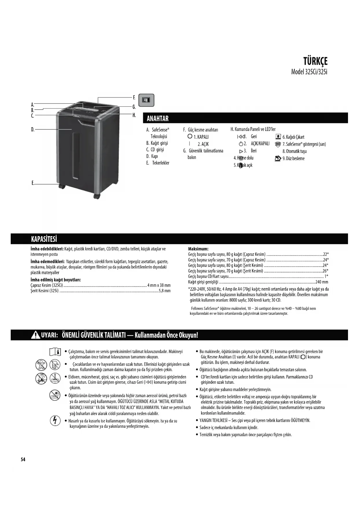 UYARI: t Çalıştırma, bakım ve servis gereksinimleri talimat kılavuzundadır. Makineyi çalıştırmadan önce talimat kılavuzunun tamamını okuyun.t Çocuklardan ve ev hayvanlarından uzak tutun. Ellerinizi kağıt girişinden uzak tutun. Kullanılmadığı zaman daima kapatın ya da fişi prizden çekin.t Eldiven, mücevherat, giysi, saç vs. gibi yabancı cisimleri öğütücü girişlerinden uzak tutun. Cisim üst girişten girerse, cihazı Geri () konuma getirip cismi çıkarın.t Öğütücünün üzerinde veya yakınında hiçbir zaman aerosol ürünü, petrol bazlı ya da aerosol yağ kullanmayın. ÖĞÜTÜCÜ ÜZERİNDE ASLA “METAL KUTUDA BASINÇLI HAVA” YA DA “HAVALI TOZ ALICI” KULLANMAYIN. Yakıt ve petrol bazlı yağ buharları alev alarak ciddi yaralanmaya neden olabilir.t Hasarlı ya da kusurlu ise kullanmayın. Öğütücüyü sökmeyin. Isı ya da su kaynağının üzerine ya da yakınlarına yerleştirmeyin.t Bu makinede, öğütücünün çalışması için AÇIK (F) konuma getirilmesi gereken bir Güç Kesme Anahtarı (I) vardır. Acil bir durumda, anahtarı KAPALI () konuma götürün. Bu işlem, makineyi derhal durdurur. t Öğütücü başlığının altında açıkta bulunan bıçaklarla temastan sakının. t CD'ler/kredi kartları için sadece belirtilen girişi kullanın. Parmaklarınızı CD girişinden uzak tutun.t Kağıt girişine yabancı maddeler yerleştirmeyin.t Öğütücü, etikette belirtilen voltaj ve amperaja uygun doğru topraklanmış bir elektrik prizine takılmalıdır. Topraklı priz, ekipmana yakın ve kolayca erişilebilir olmalıdır. Bu ürünle birlikte enerji dönüştürücüleri, transformatörler veya uzatma kordonları kullanılmamalıdır.t YANGIN TEHLİKESİ – Ses çipi veya pil içeren tebrik kartlarını ÖĞÜTMEYİN.t Sadece iç mekanlarda kullanım içindir.t Temizlik veya bakım yapmadan önce parçalayıcı fişten çekin.