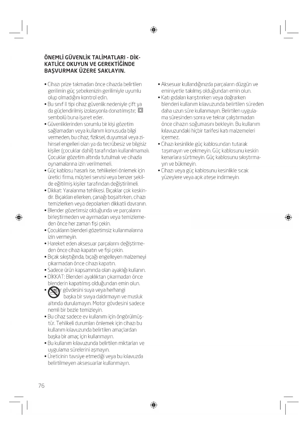Guc kablosu hasarli ise, tehlikeleri onlemek icin uretici firma, musteri servisi veya benzer sekilde egilmis kisiler tarafindan degistirilmeli. - Dikkat: Yaralanma tehlikesi. Bicaklar cok keskindir. Bicaklari ellrken, canagi bosaltirken, cihazi temizlerken veya depolarken dikkatli davranin.
