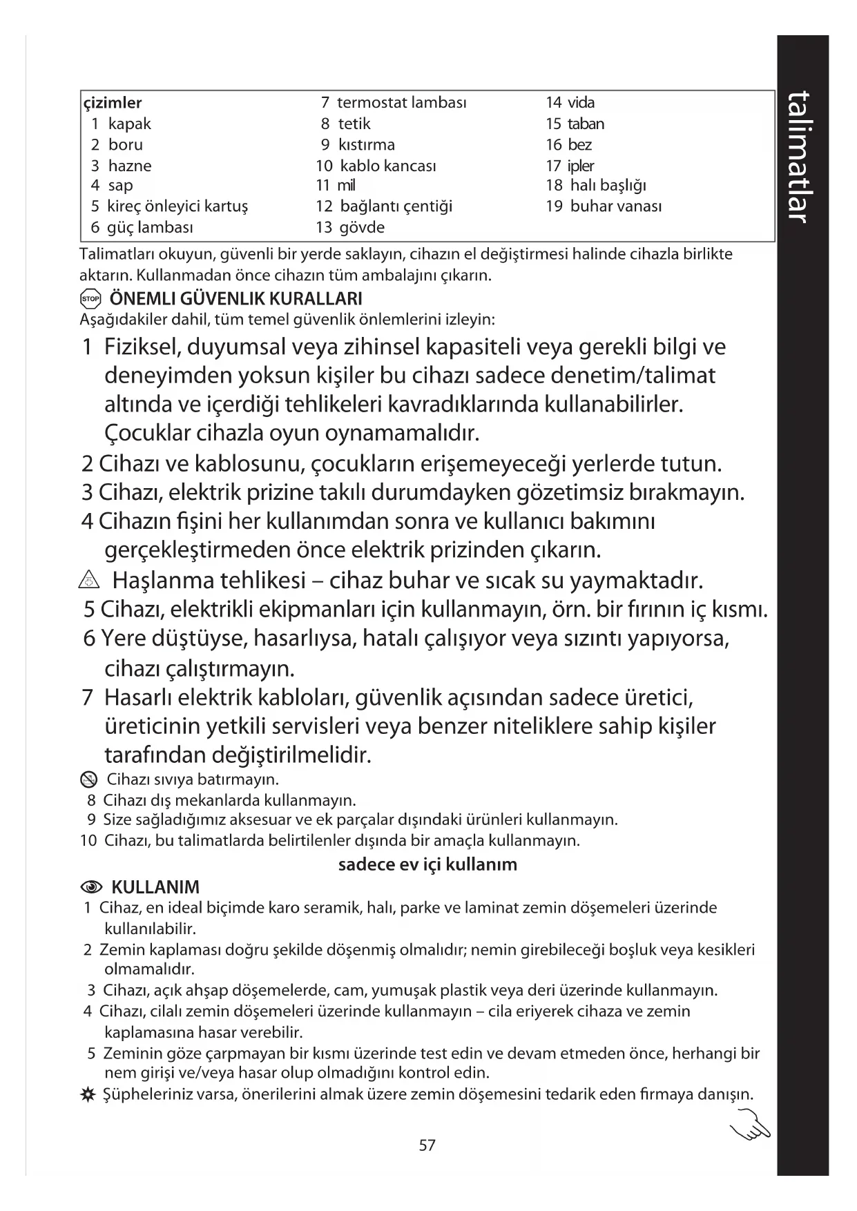 Aşağıdakiler dahil, tüm temel güvenlik önlemlerini izleyin: 1 Fiziksel, duyumsal veya zihinsel kapasiteli veya gerekli bilgi ve deneyimden yoksun kişiler bu cihazı sadece denetim/talimat altında ve içerdiği tehlikeleri kavradıklarında kullanabilirler. Çocuklar cihazla oyun oynamamalıdır. 2 Cihazı ve kablosunu, çocukların erişemeyeceği yerlerde tutun. 3 Cihazı, elektrik prizine takılı durumdayken gözetimsiz bırakmayın. 4 Cihazın fişini her kullanımdan sonra ve kullanıcı bakımını gerçekleştirmeden önce elektrik prizinden çıkarın. $ Haşlanma tehlikesi – cihaz buhar ve sıcak su yaymaktadır. 5 Cihazı, elektrikli ekipmanları için kullanmayın, örn. bir fırının iç kısmı. 6 Yere düştüyse, hasarlıysa, hatalı çalışıyor veya sızıntı yapıyorsa, cihazı çalıştırmayın. 7 Hasarlı elektrik kabloları, güvenlik açısından sadece üretici, üreticinin yetkili servisleri veya benzer niteliklere sahip kişiler tarafından değiştirilmelidir. H Cihazı sıvıya batırmayın. 8 Cihazı dış mekanlarda kullanmayın. 9 Size sağladığımız aksesuar ve ek parçalar dışındaki ürünleri kullanmayın. 10 Cihazı, bu talimatlarda belirtilenler dışında bir amaçla kullanmayın. sadece ev içi kullanım C KULLANIM 1 Cihaz, en ideal biçimde karo seramik, halı, parke ve laminat zemin döşemeleri üzerinde kullanılabilir. 2 Zemin kaplaması doğru şekilde döşenmiş olmalıdır; nemin girebileceği boşluk veya kesikleri olmamalıdır. 3 Cihazı, açık ahşap döşemelerde, cam, yumuşak plastik veya deri üzerinde kullanmayın. 4 Cihazı, cilalı zemin döşemeleri üzerinde kullanmayın – cila eriyerek cihaza ve zemin kaplamasına hasar verebilir. 5 Zeminin göze çarpmayan bir kısmı üzerinde test edin ve devam etmeden önce, herhangi bir nem girişi ve/veya hasar olup olmadığını kontrol edin. , Şüpheleriniz varsa, önerilerini almak üzere zemin döşemesini tedarik eden firmaya danışın. talimatlar çizimler 1 kapak 2 boru 3 hazne 4 sap 5 kireç önleyici kartuş 6 güç lambası 7 termostat lambası 8 tetik 9 kıstırma 10 kablo kancası 11 mil 12 bağlantı çentiği 13 gövde 14 vida 15 taban 16 bez 17 ipler 18 halı başlığı 19 buhar vanası58 d BİRLEŞTİRME 6 Tabanın arka kısmındaki vidayı sökün. 7 Gövdeyi tabana takın. 8 Vidayı, gövdenin alt kısmındaki delikten geçirerek yeniden takın. 9 Milin alt kısmını, gövdenin üst kısmına doğru itin. 10 Mili, bağlantı çentiği gövdedeki deliği kavrayana dek döndürün. 11 Kabloyu, kablo kancalarının etrafına sarın. C BEZ 12 İpleri gevşetin. 13 Bezi tabanın üzerine geçirin. 14 Bezin kenarlarını yukarı, tabanın etrafını çevreleyen kenarlığın üzerine kaldırın. 15 Bezi tabana sabitlemek için ipleri gerin. C DOLDURMA 16 Hazneyi yukarı doğru çekerek gövdeden çıkarın. 17 Hazneyi ters çevirin ve kapağın vidasını sökerek ayırın. 18 Kapağı ve boruyu hazneden çıkarın. 19 Hazneyi temiz soğuk su ile doldurun. , Suya herhangi bir şey eklemeyin – cihaza ve kireç önleyici kartuşa hasar verebilirsiniz. 20 Boruyu hazneye doğru kaydırın ve kapağın üzerine vidalayın. 21 Hazneyi yukarı, sağa doğru döndürün ve tekrar gövdeye takın. C EĞME VEYA KİLİTLEME? 22 Cihazın gövdesiyle tabanının birleştiği bağlantı yeri iki farklı pozisyona sahiptir. 23 Pozisyon değiştirirken, tabanın ön kısmını bir ayağınızla hafifçe tutun. 24 Sapı/gövdeyi dikey konumda kilitlemek için, sapı ileri doğru itin. 25 Sapın/gövdenin kilidini açmak için sapı geriye doğru çekin, böylece taban serbestçe hareket edebilir (dikey bir elektrikli süpürge gibi).