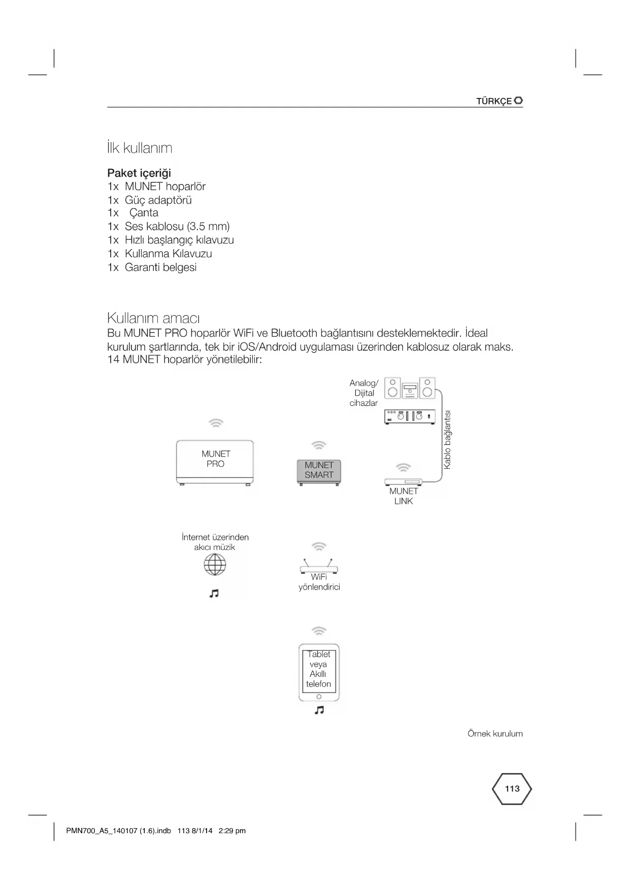 İlk kullanım Paket içeriği 1x MUNET hoparlör 1x Güç adaptörü 1x Çanta 1x Ses kablosu (3.5 mm) 1x Hızlı başlangıç kılavuzu 1x Kullanma Kılavuzu 1x Garanti belgesi Kullanım amacı Bu MUNET PRO hoparlör WiFi ve Bluetooth bağlantısını desteklemektedir. İdeal kurulum şartlarında, tek bir iOS/Android uygulaması üzerinden kablosuz olarak maks. 14 MUNET hoparlör yönetilebilir: Tablet veya Akıllı telefon MUNET SMART MUNET PRO MUNET LINK Analog/ Dijital cihazlar WiFi yönlendirici İnternet üzerinden akıcı müzik Kablo bağlantısı Örnek kurulum PMN700_A5_140107 (1.6).indb 113 8/1/14 2:29 pmTÜRKÇE