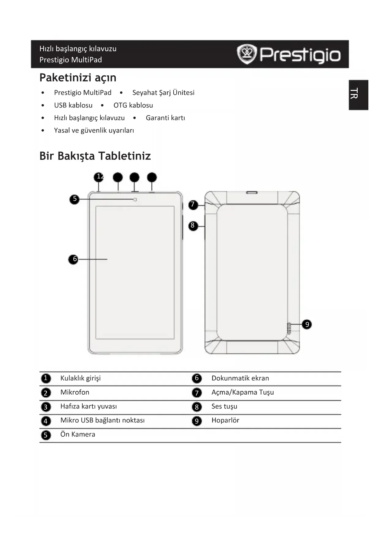 ÖnKameraTR Hızlı başlangıç kılavuzu Prestigio MultiPad Tuşlar Tuş Tanım İşlev Açma/ Kapama