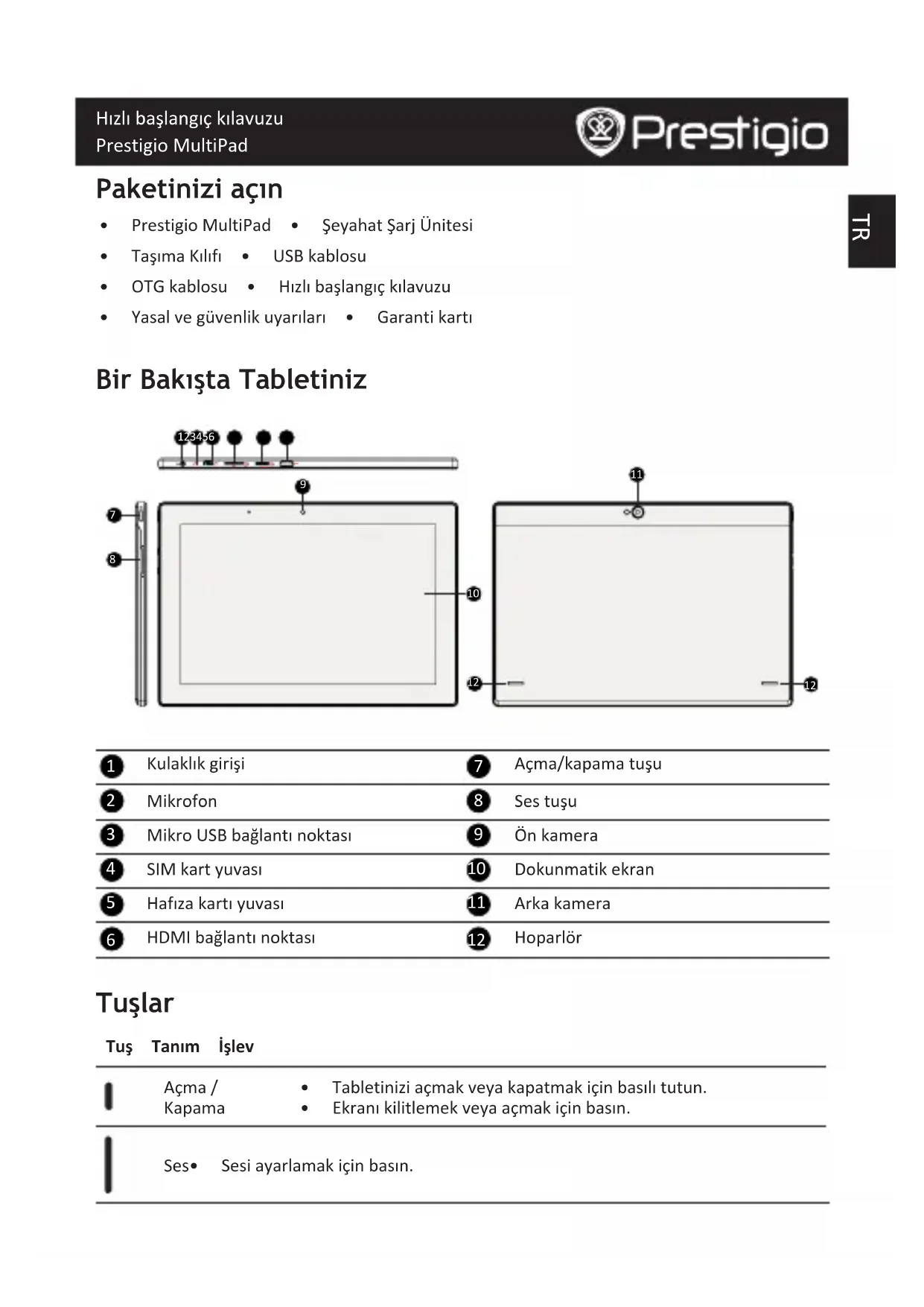 - Ekranıkilitlemekveyaaçmakiçinbasın. Ses • Sesiayarlamakiçinbasın.TR Hızlı başlangıç kılavuzu Prestigio MultiPad Geri