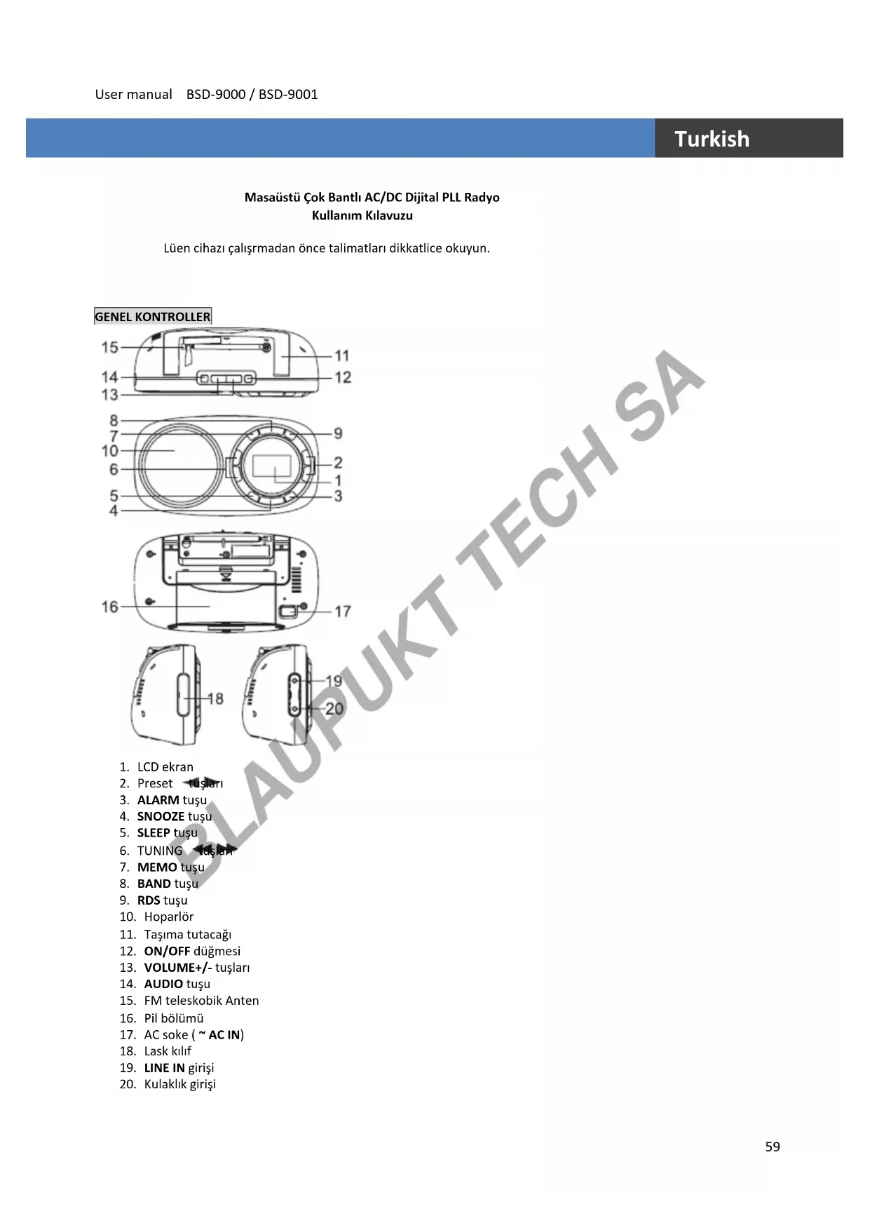 GÜÇ KAYNAĞI Bu cihaz AC 230~ 50Hz veya 4 x 1.5 V R20/UM1/"D" pil (ilave edilmemiştir) ile çalışmaktadır.