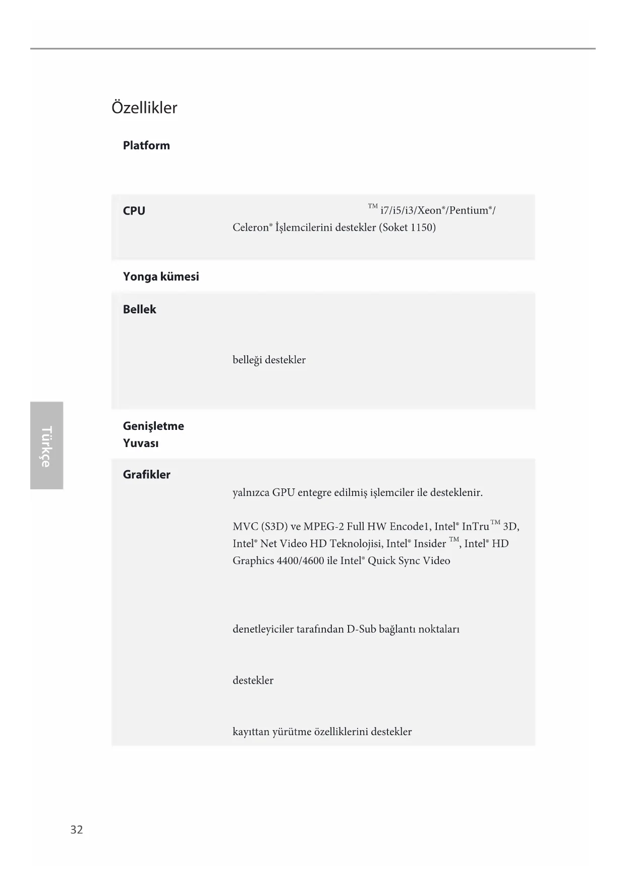 •Intel® HD Graphcs Dahl Görsellern destekler : AVC,