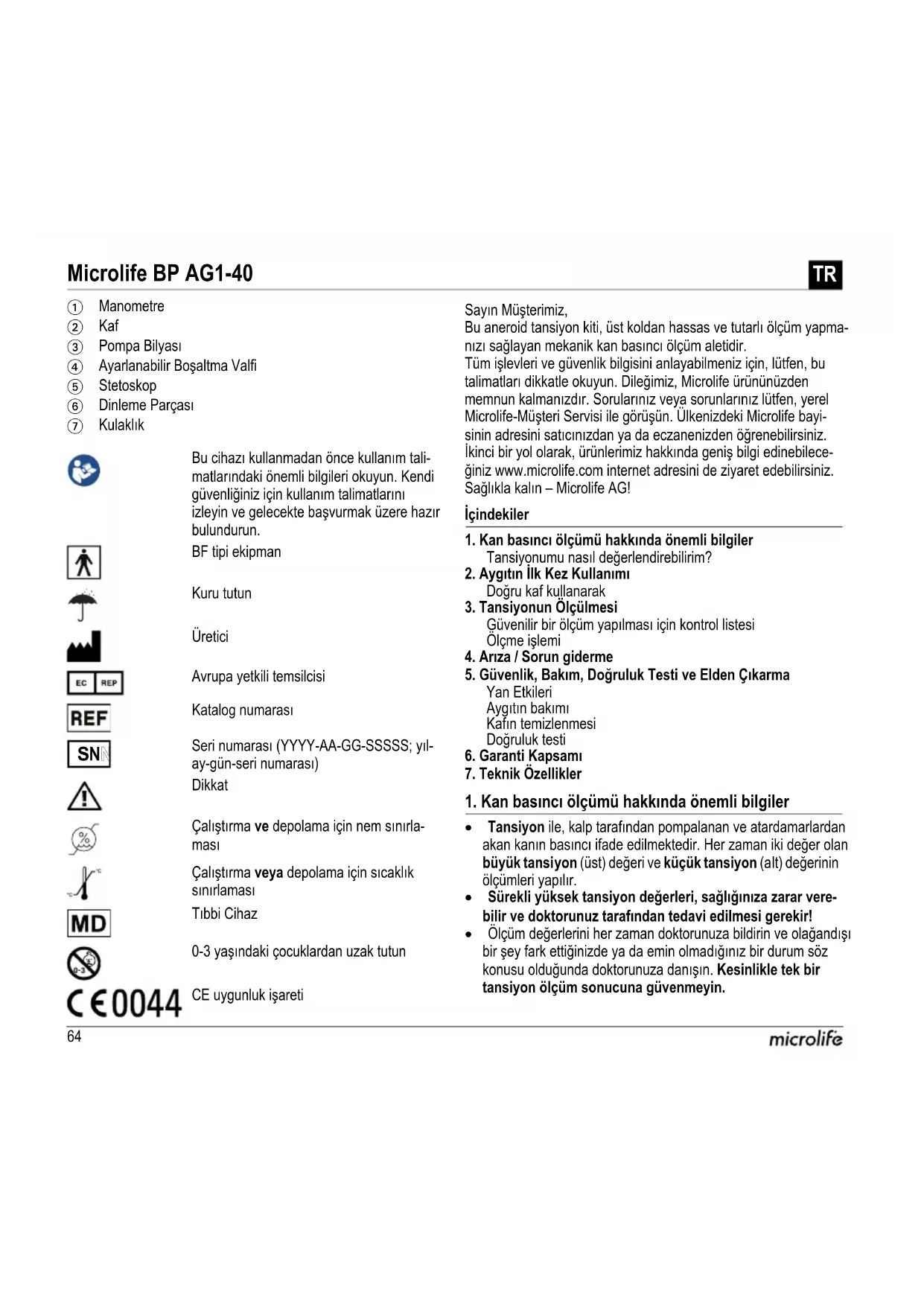 Kullanım için talimatları okuyunuz. Bu doküman cihazın güvenli kullanımı için önemli bilgiler içermektedir. Lütfen cihazı kullan- madan önce bu dökümanı tamamen okuyunuz ve gelecekte tekrar başvurmak üzere saklayınız. Bu ürün, sadece bu broşürde açıklanan amaçlar çerçevesinde kullanılabilir. İmalatçı, yanlış uygulamadan kaynaklanan zarar ziyan için sorumlu tutulamaz. Aygıt, hassas parçalara sahiptir ve dikkatli biçimde kullanılma- lıdır. «Teknik Özellikler» bölümünde açıklanan saklama ve çalıştırma koşullarını göz önünde bulundurun! Kaf, hassastır ve dikkatli biçimde kullanılmalıdır. Kafı cihaza taktıktan sonra pompalayın. Hiç bir zaman 300 mmHg’dan fazla şişirmeyiniz. Kafı kaldırmadan önce her zaman havasını tamamen indiriniz. Hasar gördüğünü düşünüyorsanız ya da herhangi bir anormal durum sezdiyseniz, aygıtı kullanmayın. Broşürün ilgili bölümlerindeki diğer güvenlik talimatlarını da okuyun. Bu cihaz tarafından verilen ölçüm sonuçları bir teşhis olarak değerlendirilmemelidir. Mutlaka doktorunuza danışınız. Özel- likle, hasta semptomları cihaz ölçümüyle uyuşmuyorsa sadce ölçüm sonucuna güvenmeyin. Diğer semptomları ve hastanın geri bildirimini göz önünde bulundurarak doktorunuzla görüşün veya gerekiyorsa ambulans çağırın. Yanlış ölçümleri veya yaralanmaları önlemek amacıyla hastada aşağıdaki kontrendikasyonlar varsa bu cihazı kullanmayın. Bu cihazı hareketli bir araçta (örneğin, bir araba veya uçakta) kullanmayın. Yenidoğan kullanımı için kontraendikedir. Yenidoğan manşetle- riyle veya yenidoğan hastalarında kullanmayın. Aneroid tansiyon aletinde sık sık kalibrasyon yapılması gerekir (en az her 6 ayda bir). Gözlemci hatasından kaçınmak için uzmanlık ve sürekli eğitim gereklidir. Bu, kullanıcının osilasyon için bir stetoskop kullanarak Korotkoff seslerini bulmasına yardım eder. Etraftaki gürültü ölçüm ve değerleri bozabilir. Uygun manşet sönme oranını sağlamak için el hüneri gereklidir. Hassas ölçüm yapmak için kusursuz işitme ve görme yeteneği gereklidir. Yan Etkileri Cihazın kullanımında bazı ufak yan etkiler görülebilir Cihaz çekiştirildiğinde veya bir yere çarptığında kalibrasyonu kaybedebilir (hatalı olabilir) ve bu da hatalı değerlere yol açabilir. Gözlemcilerin ön yargıları ve son rakam tercihi olabilir ve bu da hatalı değerlere yol açabilir. Aygıtın bakımı Aygıtı sadece yumuşak ve kuru bir bezle temizleyin. Kafın temizlenmesi Kaf üzerindeki noktaları sabunlu su ile nemlendirilmiş bezle dikkatli bir şekilde gideriniz. Doğruluk testi Her 2 yılda bir ya da mekanik darbeye maruz kalması (örneğin, düşürülmesi) durumunda, ürünün doğru çalışıp çalışmadığının test edilmesini öneririz. Test işlemini ayarlamak için, lütfen, yerel Microlife-Servisi ile görüşün (bkz ön söz).
