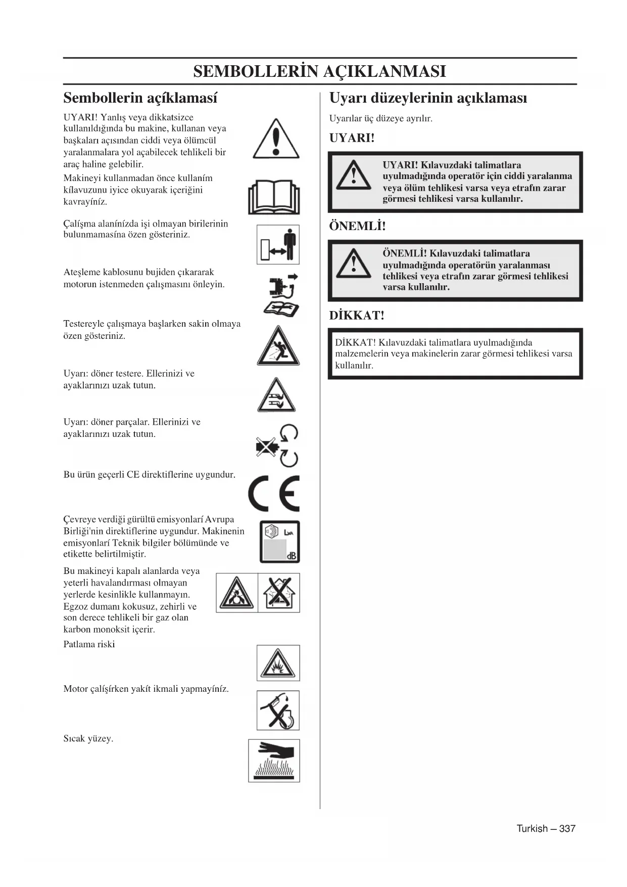 Sembollerin açíklamasí UYARI! Yanlıfl veya dikkatsizce kullanıldı¤ında bu makine, kullanan veya baflkaları açısından ciddi veya ölümcül yaralanmalara yol açabilecek tehlikeli bir araç haline gelebilir.Makineyi kullanmadan önce kullaním kílavuzunu iyice okuyarak içeri¤ini kavrayíníz.Çalíflma alanínízda ifli olmayan birilerinin bulunmamasína özen gösteriniz.Ateflleme kablosunu bujiden çıkararak motorun istenmeden çalıflmasını önleyin.Testereyle çalıflmaya bafllarken sakin olmaya özen gösteriniz.Uyarı: döner testere. Ellerinizi ve ayaklarınızı uzak tutun.Uyarı: döner parçalar. Ellerinizi ve ayaklarınızı uzak tutun.Bu ürün geçerli CE direktiflerine uygundur.Çevreye verdi¤i gürültü emisyonlarí Avrupa Birli¤i'nin direktiflerine uygundur. Makinenin emisyonlarí Teknik bilgiler bölümünde ve etikette belirtilmifltir.Bu makineyi kapalı alanlarda veya yeterli havalandırması olmayan yerlerde kesinlikle kullanmayın. Egzoz dumanı kokusuz, zehirli ve son derece tehlikeli bir gaz olan karbon monoksit içerir.Patlama riskiMotor çalíflírken yakít ikmali yapmayíníz.Sıcak yüzey. Uyarı düzeylerinin açıklaması Uyarılar üç düzeye ayrılır. UYARI! ÖNEML‹! D‹KKAT!