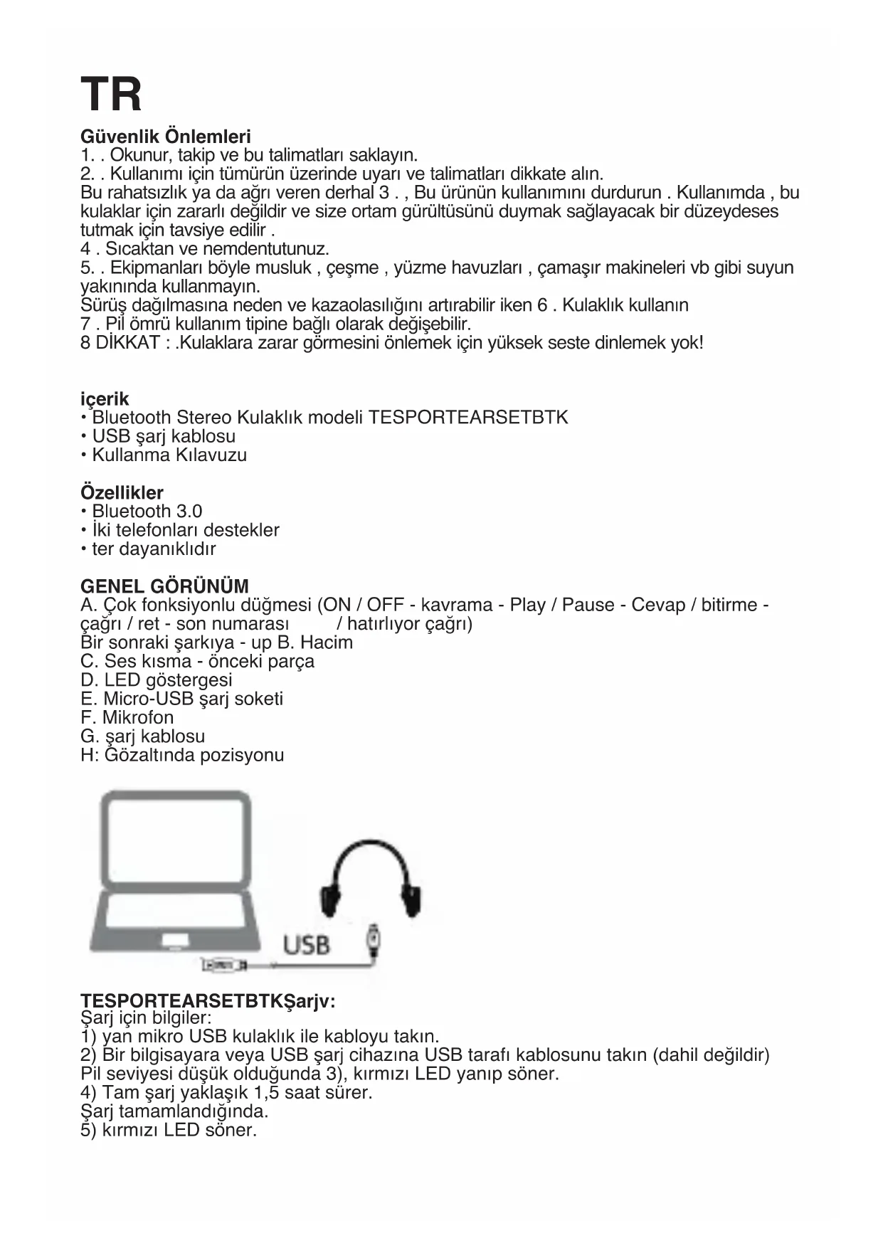 A. Çok fonksiyonlu düğmesi (ON / OFF - kavrama - Play / Pause - Cevap / bitirme - çağrı / ret - son numarası / hatırlıyor çağrı) Bir sonraki şarkıya - up B. Hacim C. Ses kısma - önceki parça D. LED göstergesi E. Micro-USB şarj soketi F. Mikrofon G. şarj kablosu H: Gözaltında pozisyonu Charging the TESPORTEARSETBTK TESPORTEARSETBTKŞarjv: Şarj için bilgiler:
