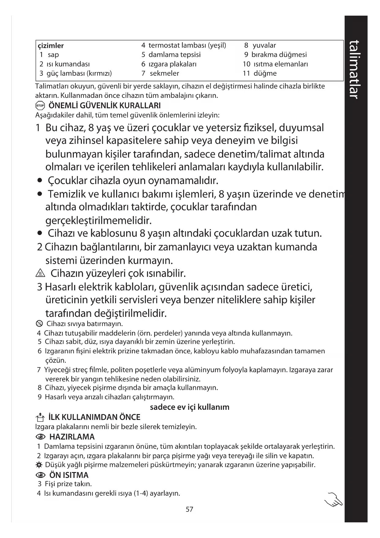 U İLK KULLANIMDAN ÖNCE Izgara plakalarını nemli bir bezle silerek temizleyin.