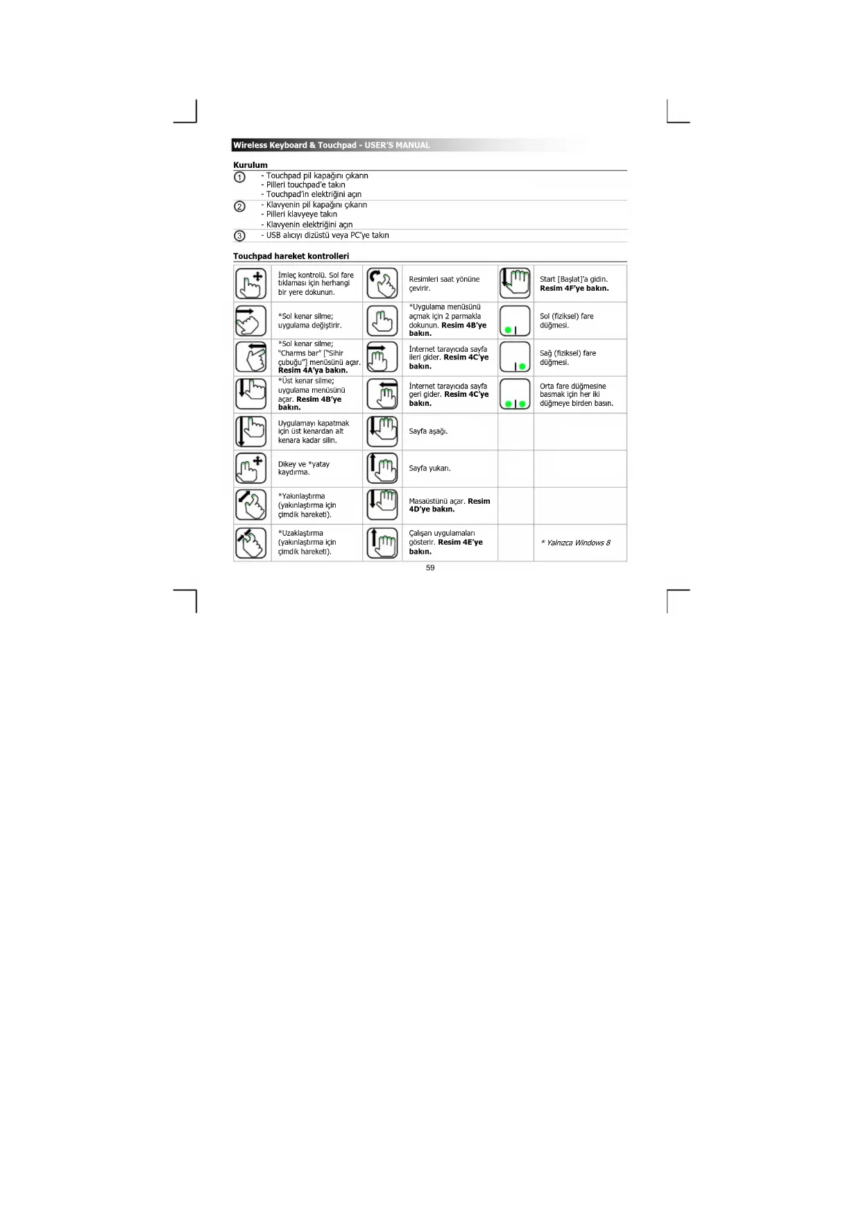 Kurulum - Touchpad pil kapağını çıkarın - Pilleri touchpad’e takın - Touchpad’in elektriğini açın - Klavyenin pil kapağını çıkarın - Pilleri klavyeye takın - Klavyenin elektriğini açın - USB alıcıyı dizüstü veya PC’ye takın Touchpad hareket kontrolleri