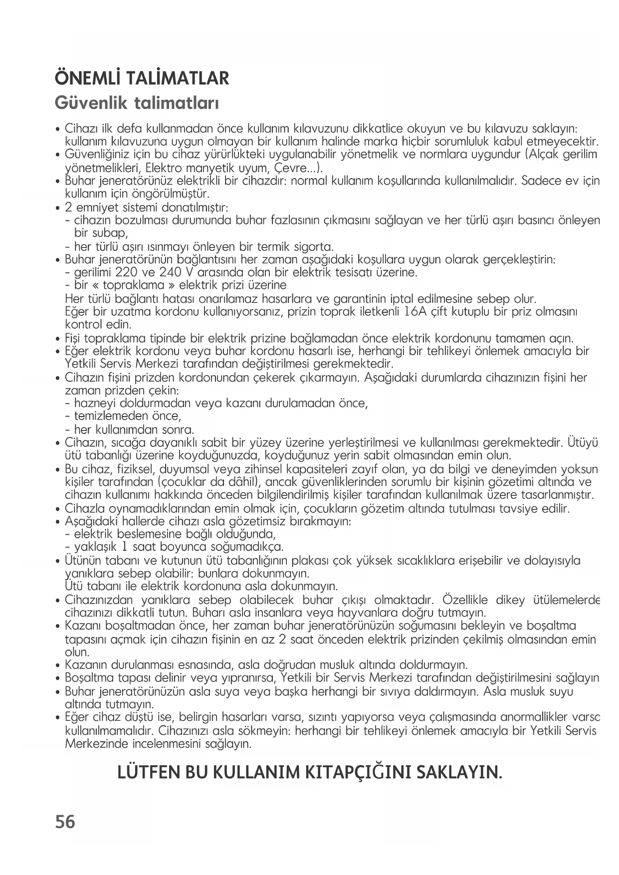 • Buhar jeneratörünüz elektrikli bir cihazdır: normal kullanım koşullarında kullanılmalıdır. Sadece ev için
