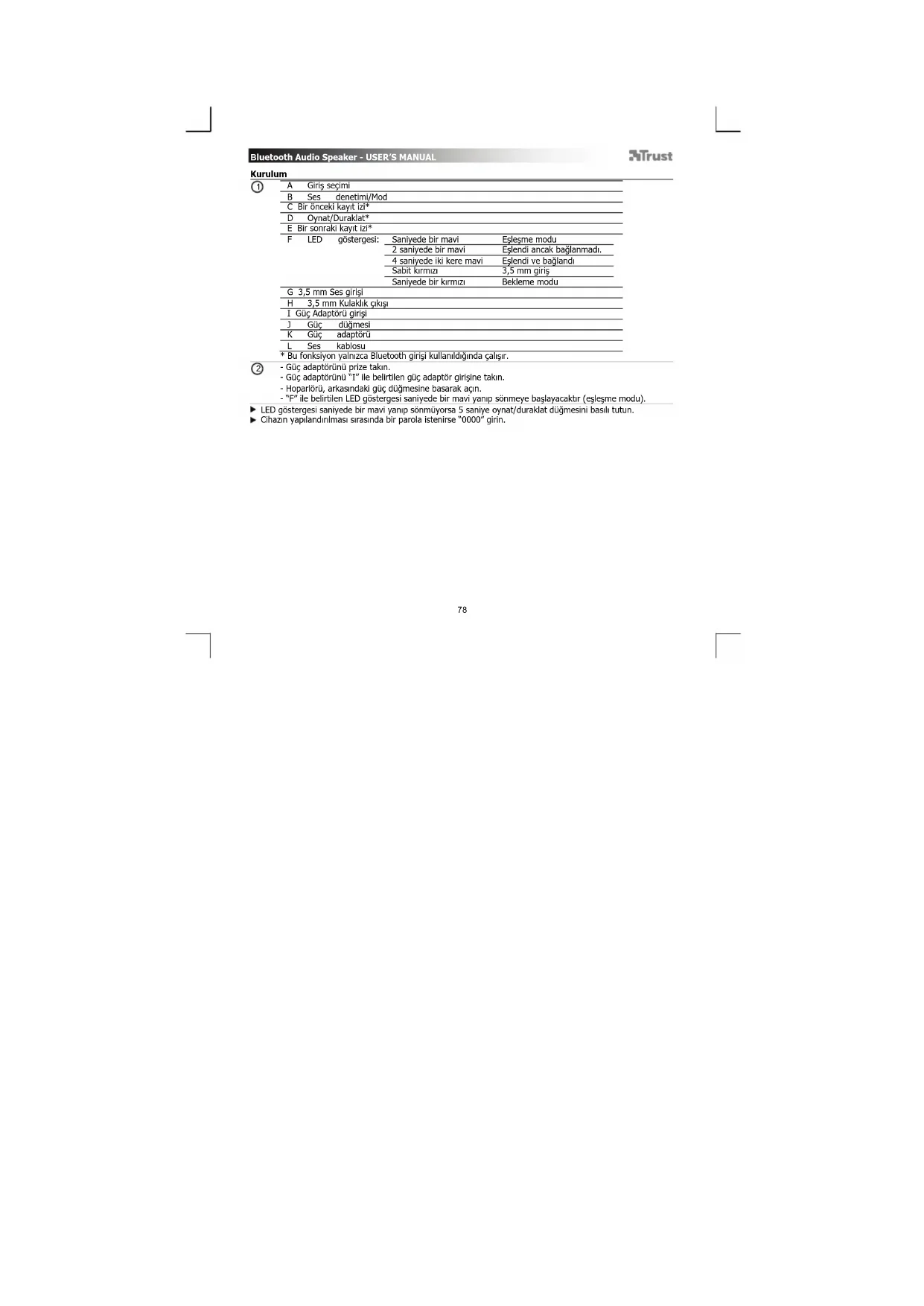 Standart Yapılandırma iPad/iPhone - “Settings” [“Ayarlar”] öğesine gidin. - “General” [“Genel”] ayarlara gidin. - “Bluetooth” [“Bluetooth”] öğesine gidin. - Bluetooth fonksiyonunun açık olduğundan emin olun. - Bluetooth cihazlar listesinde “Trust BT Audio” öğesini seçin. (hoparlörün eşleşme modunda olduğundan emin olun) Cihaz durumu “paired” [“eşleşti”] olduğunda cihazınız kullanıma hazırdır.