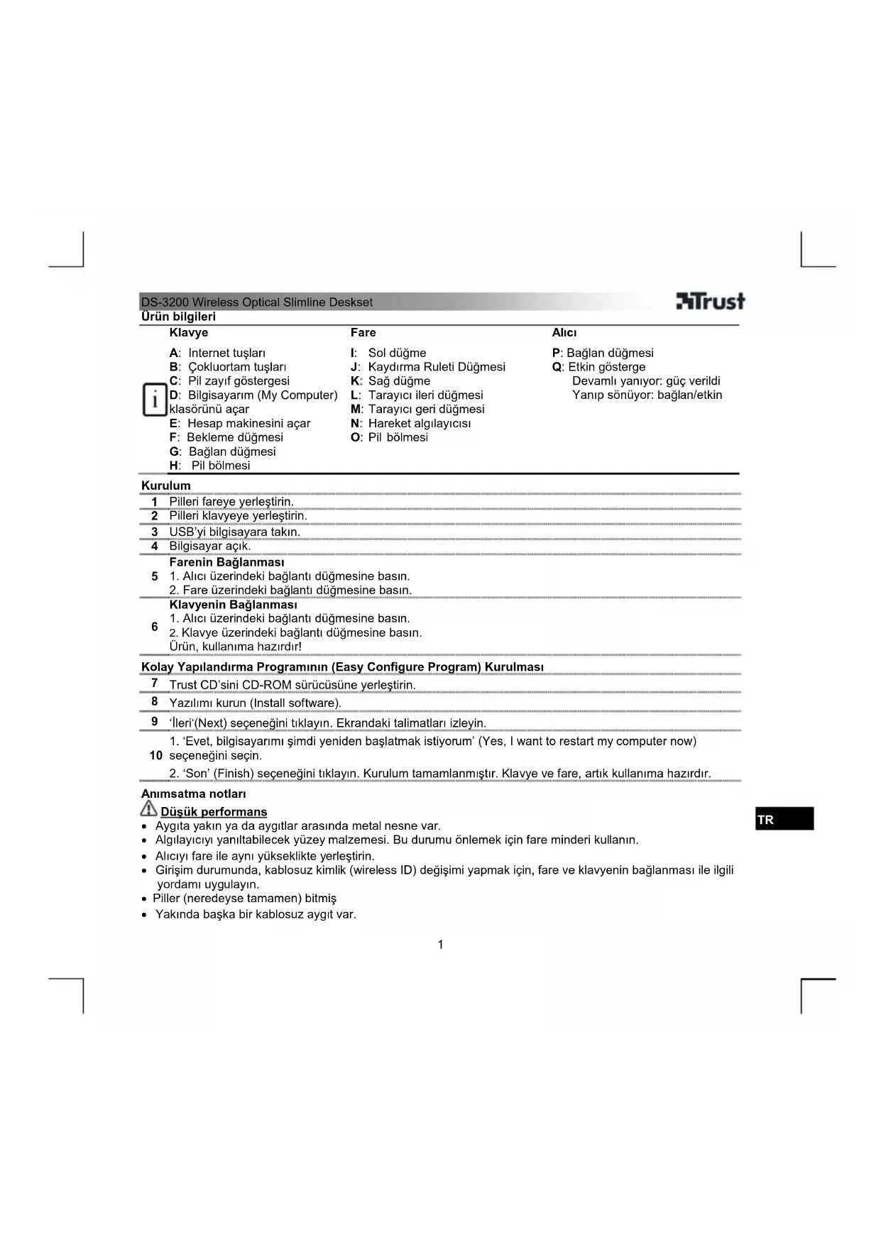 - Bu kullanım kılavuzu, Trust International B.V. kuruluşunun izni olmadan kısmen veya tamâmen çoğaltılamaz.DS-3200 Wireless Optical Slimline Deskset