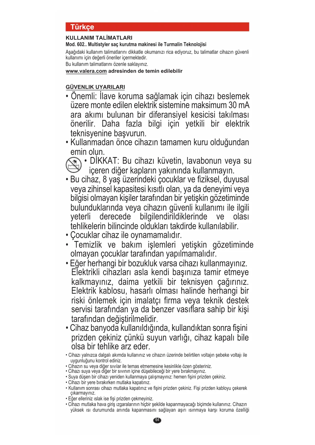 • DİKKAT: Bu cihazı küvetin, lavabonun veya su