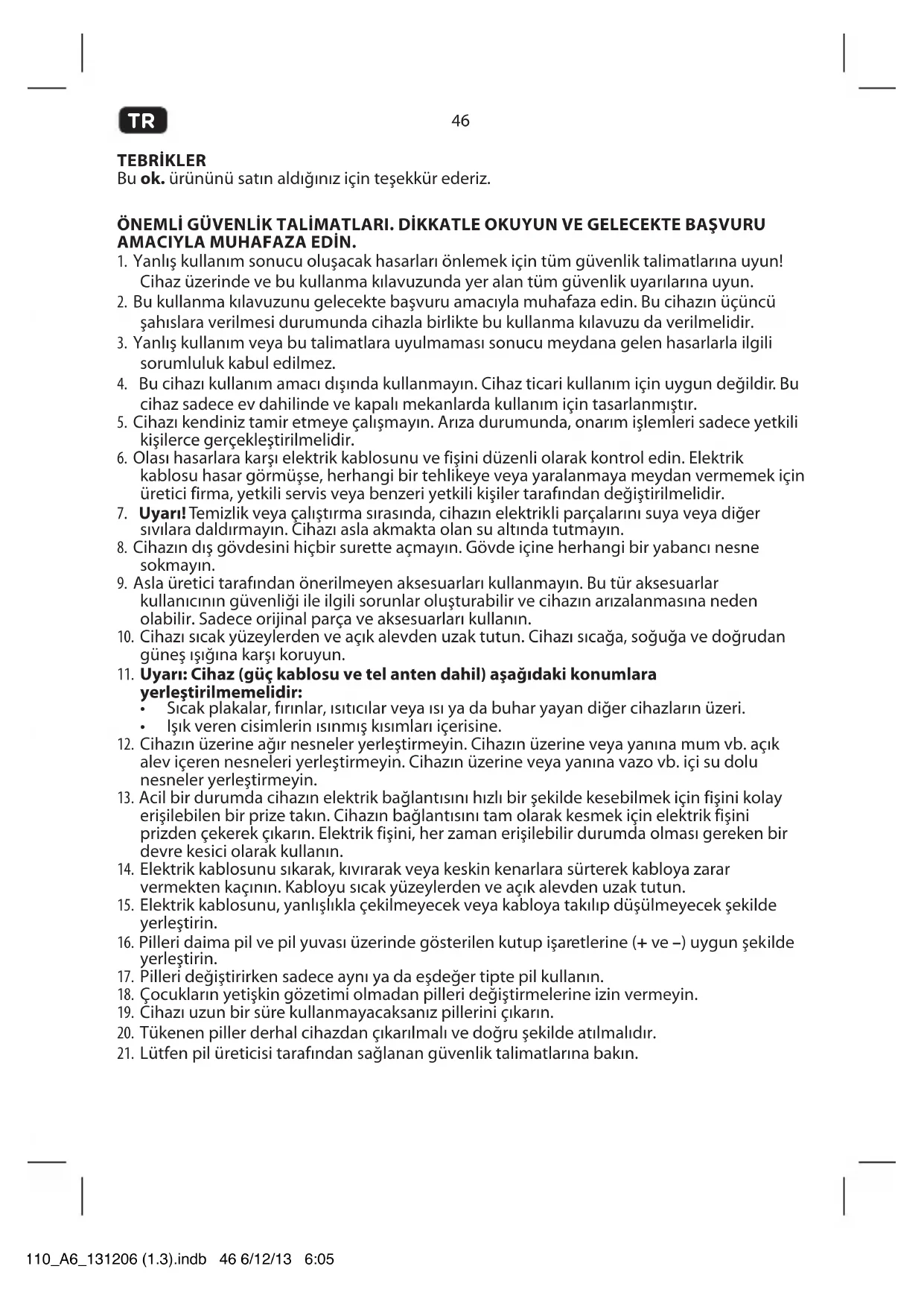 - Bu cihazi kullanim amaci disinda kullanmayin. Cihaz ticari kullanim icin uygun degildir. Bu cihaz sadece ev dahilinde ve kapali mekanlarda kullanim icin tasarlanmistir.