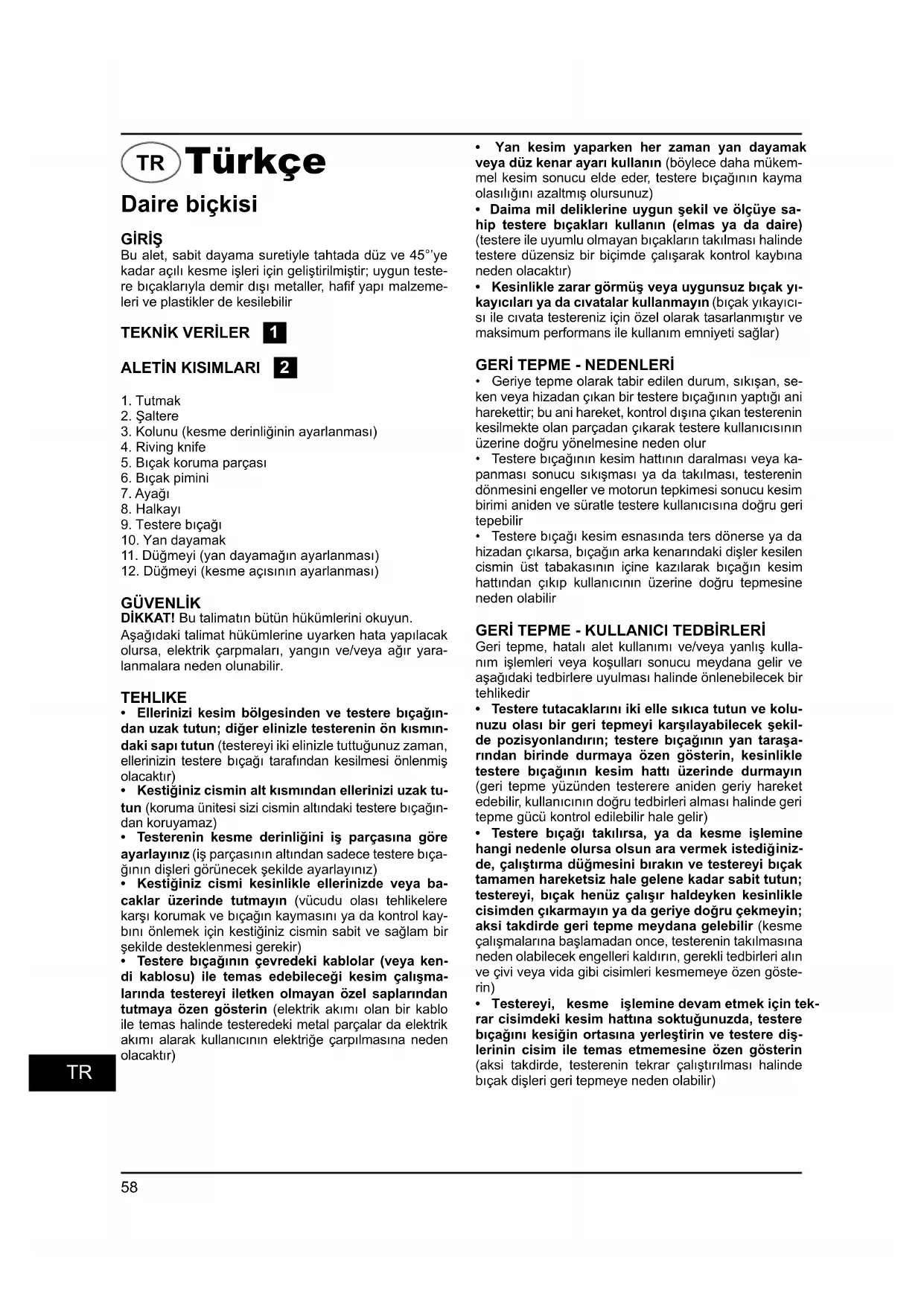 - Testere bıçağı kesim esnasında ters dönerse ya da hizadan çıkarsa, bıçağın arka kenarındaki dişler kesilen cismin üst tabakasın ın içine kazılarak bıçağın kesim hattından çıkıp kullanıcının üzerine doğru tepmesine neden olabilirGERİ TEPME - KULLANICI TEDBİRLERİ Geri tepme, hatalı alet kullanımı ve/veya yanlış kulla- nım işlemleri veya koşulları sonucu meydana gelir ve aşağıdaki tedbirlere uyulması halinde önlenebilecek bir tehlikedir