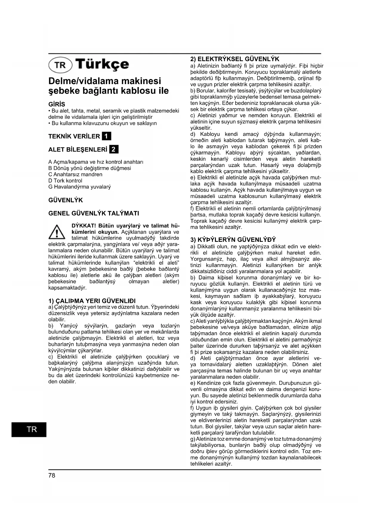 DÝKKAT! Bütün uyarýlarý ve talimat hü- kümlerini okuyun. Açýklanan uyarýlara ve talimat hükümlerine uyulmadýðý takdirde elektrik çarpmalarýna, yangýnlara ve/ veya aðýr yara- lanmalara neden olunabilir. Bütün uyarýlarý ve talimat hükümlerini ileride kullanmak üzere saklayýn. Uyarý ve talimat hükümlerinde kullanýlan “elektrikli el aleti” kavramý, akým þebekesine baðlý (þebeke baðlantý kablosu ile) aletlerle akü ile çalýþan aletleri (akým þebekesine baðlantýsý olmayan aletler) kapsamaktadýr.