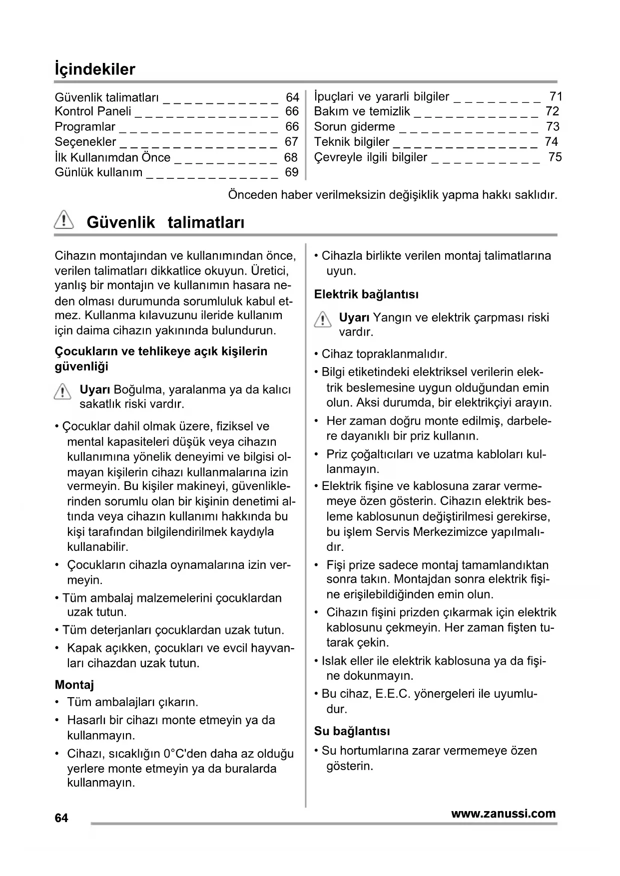 Güvenlik talimatları _ _ _ _ _ _ _ _ _ _ _ 64
