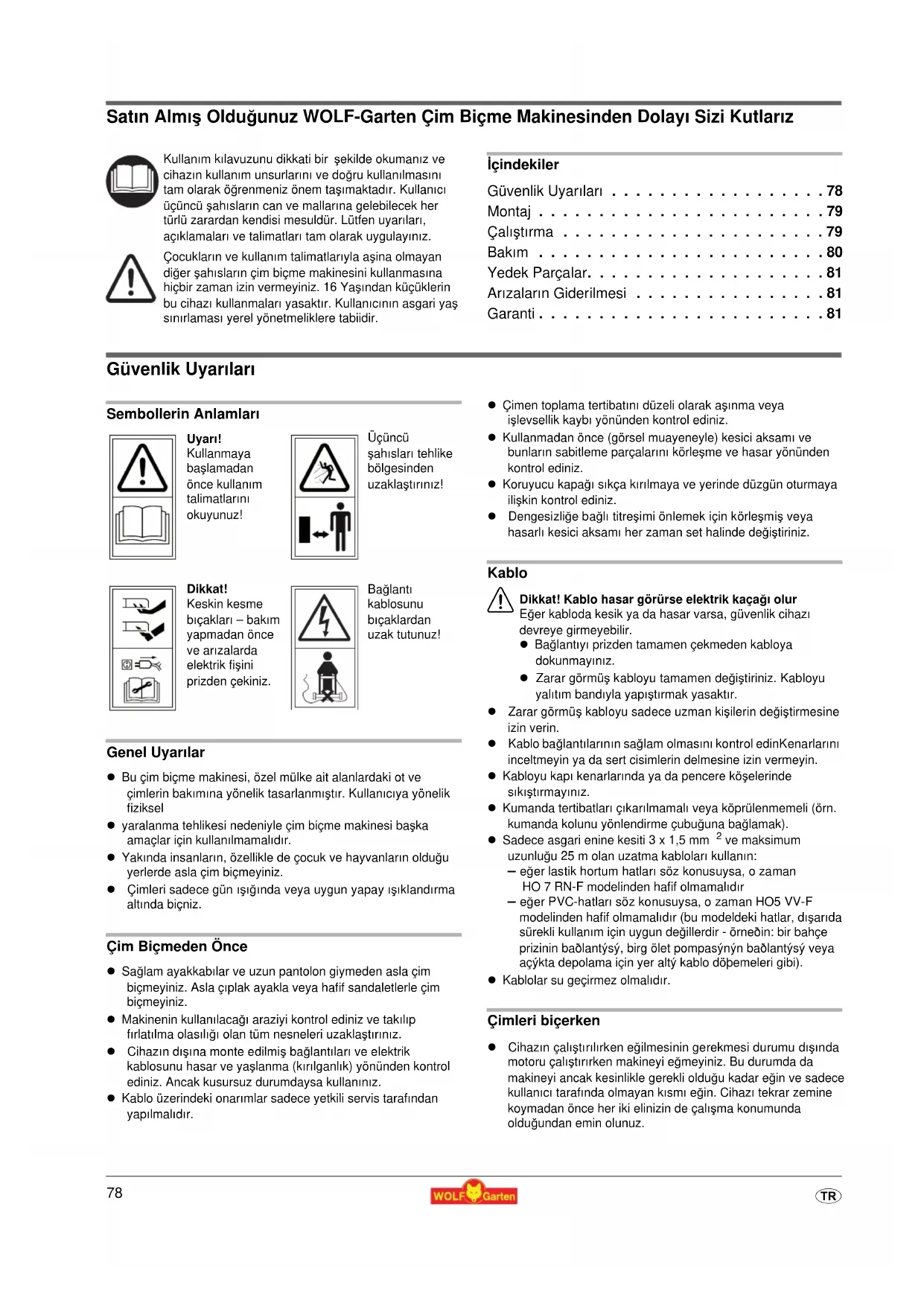 - Satın Almış Olduğunuz WOLF-Garten Çim Biçme Makinesinden Dolayı Sizi Kutlarız Đçindekiler Güvenlik Uyarıları p. 78