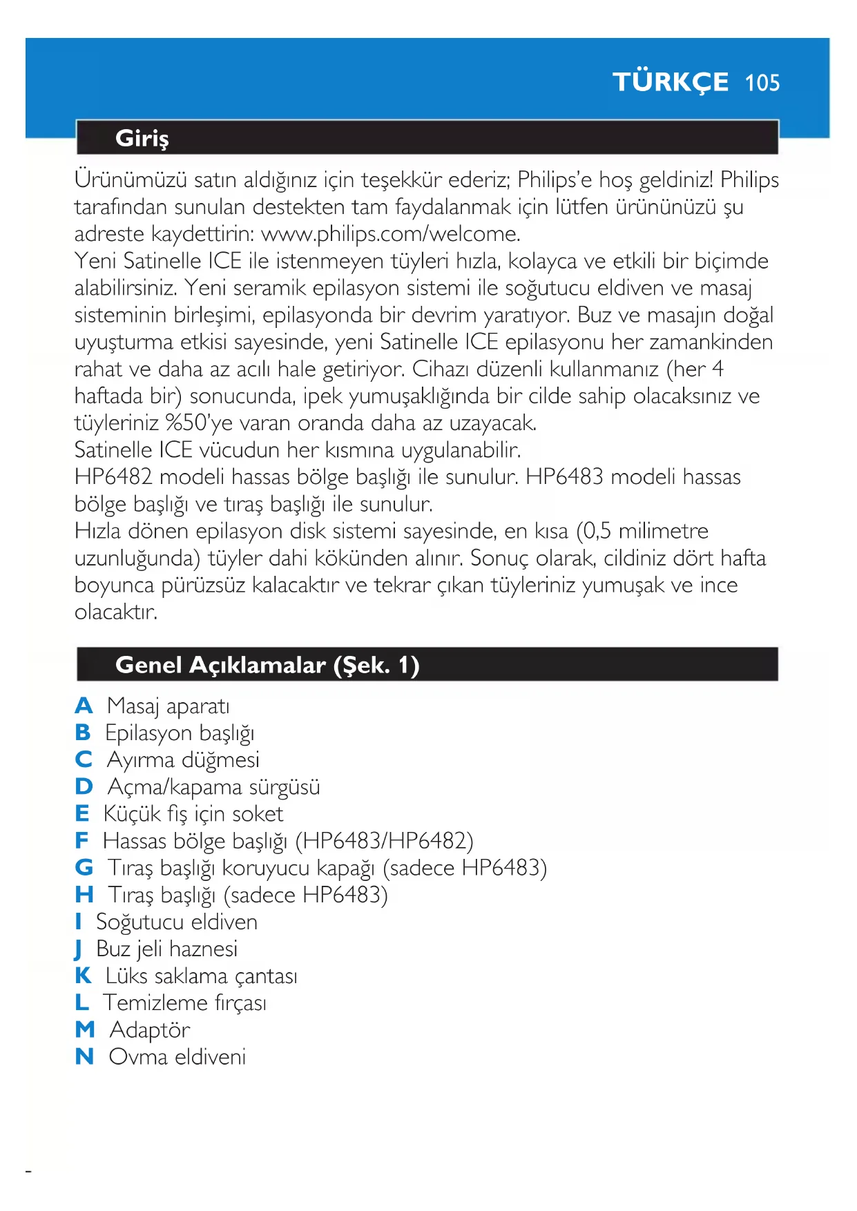 PORTUGUÊS DO BRASIL 101Problema Causa Solução A cabeça depiladora não tocou a pele. Verique se a cabeça depiladora está em contato com a pele de forma adequada durante a depilação. Você umedeceu a pele com água ou com um creme ou outro produto para pele antes da depilação. Verique se a pele está completamente seca e sem substâncias oleosas. Não use nenhum creme, hidratante ou produto para pele antes de começar a depilação. O aparelho não funciona. A tomada à qual o aparelho está conectado não está alimentada. Verique se a tomada está alimentada. Se você usar uma tomada em um armário de banheiro, talvez seja preciso acender a luz para ativá-la. O aparelho não está ligado. Verique se o aparelho está conectado à corrente elétrica e ligado. A cabeça depiladora não foi encaixada corretamente. Coloque a cabeça depiladora no aparelho e pressione-a até encaixar (você ouvirá um clique). Português Do Brasil102Problema Causa Solução Surgem irritações na pele. Você usou o aparelho pela primeira vez ou após um longo período sem utilizá-lo. A pele pode car um pouco irritada nas primeiras vezes em que usar o aparelho. Isso é normal e costuma desaparecer rapidamente. Para obter dicas sobre como amenizar a irritação da pele, consulte a primeira seção do capítulo ‘Uso do aparelho’. Verique também se a cabeça depiladora está limpa. A luva não está fria o suciente. Você não colocou a bolsa de gel no freezer ou no congelador. Coloque-a no freezer ou no congelador (***) por pelo menos 2 horas. A bolsa de gel não foi congelada por tempo suciente. Coloque-a sem luva no freezer ou no congelador (***) por pelo menos 2 horas. Não é possível remover a cabeça depiladora. Você não pressionou o botão de liberação. Pressione o botão de liberação e remova a cabeça depiladora do aparelho (Fig. 14). A cabeça de raspar os pêlos (modelo HP6483 somente) não pode ser removida. Você não pressionou o botão de liberação. Pressione o botão de liberação e remova a cabeça de raspar os pêlos do aparelho (Fig. 14). Português Do Brasil 103Problema Causa Solução Desempenho de raspagem reduzido (modelo HP6483 somente). A cabeça de raspar os pêlos está suja. Desligue o aparelho e desconecte-o. Retire a cabeça de raspar os pêlos e retire a unidade de corte. Limpe-as com a escova de limpeza ou na torneira. Remova os pêlos que caram presos sob o aparador. Pele com uma irritação maior do que o normal após a raspagem (modelo HP6483 somente). A unidade de corte da cabeça de raspar os pêlos está danicada ou gasta. Troque a unidade de corte. Português Do Brasil104105 Giriş Ürünümüzü satın aldığınız için teşekkür ederiz; Philips’e hoş geldiniz! Philips tarafından sunulan destekten tam faydalanmak için lütfen ürününüzü şu adreste kaydettirin: www.philips.com/welcome. Yeni Satinelle ICE ile istenmeyen tüyleri hızla, kolayca ve etkili bir biçimde alabilirsiniz. Yeni seramik epilasyon sistemi ile soğutucu eldiven ve masaj sisteminin birleşimi, epilasyonda bir devrim yaratıyor. Buz ve masajın doğal uyuşturma etkisi sayesinde, yeni Satinelle ICE epilasyonu her zamankinden rahat ve daha az acılı hale getiriyor. Cihazı düzenli kullanmanız (her 4 haftada bir) sonucunda, ipek yumuşaklığında bir cilde sahip olacaksınız ve tüyleriniz %50’ye varan oranda daha az uzayacak. Satinelle ICE vücudun her kısmına uygulanabilir. HP6482 modeli hassas bölge başlığı ile sunulur. HP6483 modeli hassas bölge başlığı ve tıraş başlığı ile sunulur. Hızla dönen epilasyon disk sistemi sayesinde, en kısa (0,5 milimetre uzunluğunda) tüyler dahi kökünden alınır. Sonuç olarak, cildiniz dört hafta boyunca pürüzsüz kalacaktır ve tekrar çıkan tüyleriniz yumuşak ve ince olacaktır. Genel Açıklamalar (Şek. 1) a Masaj aparatı B Epilasyon başlığı c Ayırma düğmesi D Açma/kapama sürgüsü E Küçük ş için soket F Hassas bölge başlığı (HP6483/HP6482) g Tıraş başlığı koruyucu kapağı (sadece HP6483) H Tıraş başlığı (sadece HP6483) i Soğutucu eldiven J Buz jeli haznesi k Lüks saklama çantası l Temizleme fırçası M Adaptör n Ovma eldiveni türkçEÖnemli Cihazı kullanmadan önce bu kullanım kılavuzunu okuyun ve gelecekte de başvurmak üzere saklayın. Tehlike Cihazı ve adaptörü kuru olarak saklayın. Uyarı Cihazı kullanmadan önce, adaptörün üzerinde belirtilen gerilimin ülkenizdeki gerilimle uygunluğunu kontrol edin. Cihazı sadece cihazla beraber verilen adaptör ile birlikte kullanın. Adaptör ya da cihazın kendisi hasarlıysa, cihazı kesinlikle kullanmayın. Adaptör hasarlıysa, bir tehlikeyi önlemek için mutlaka orijinal modeli ile değiştirildiğinden emin olun. Adaptörde bir dönüştürücü bulunmaktadır. Tehlikeli bir duruma sebep olabileceğinden, adaptörü başka bir şle değiştirmek için kesmeyin. Bu cihaz, güvenliklerinden sorumlu kişilerin nezareti veya talimatları dışında, ziksel, motor ya da zihinsel becerileri gelişmemiş veya bilgi ve tecrübe açısından eksik kişiler tarafından (çocuklar da dahil) kullanılmamalıdır. Küçük çocukların cihazla oynamaları engellenmelidir. Dikkat Cihazı 5°C ile 35°C aralığının dışındaki sıcaklıklarda kullanmayın. Cihaz çalışır durumdayken, herhangi bir kaza veya hasarı önlemek için saçlarınızdan, kirpik ve kaşlarınızdan ayrıca kıyafet, fırça, kablo vb.’den uzak tutun. Cilt tahriş olmuşsa ya da ciltte varis, kızarıklıklar, lekeler, benler (üzeri tüylü) veya yaralar varsa, cihazı doktorunuza danışmadan önce kullanmayın. Düşük bağışıklık tepkisi, şeker hastalığı, hemoli ya da bağışıklık sistemi yetmezliği olan kişiler de öncelikle doktorlarına danışmalıdır. Epilatörü ilk birkaç kullanışınızda cildiniz kızarabilir ve tahriş olabilir. Bu normal bir durum olup, zaman içinde hızla azalacaktır. C