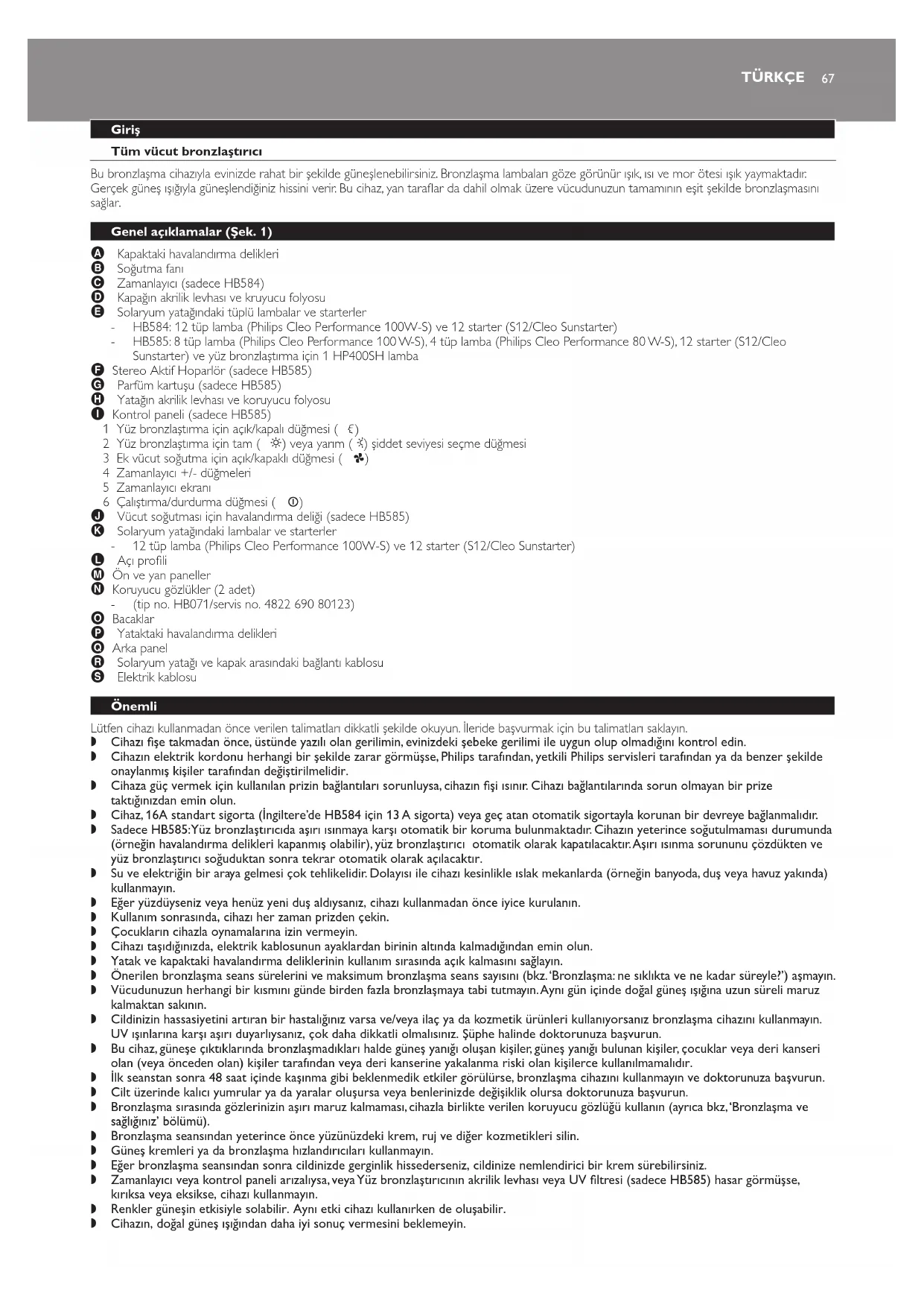 Yüz bronzlaştırıcının lambası (sadece HB585) sadece Philips yetkili servisi tarafından değiştirilebilir.