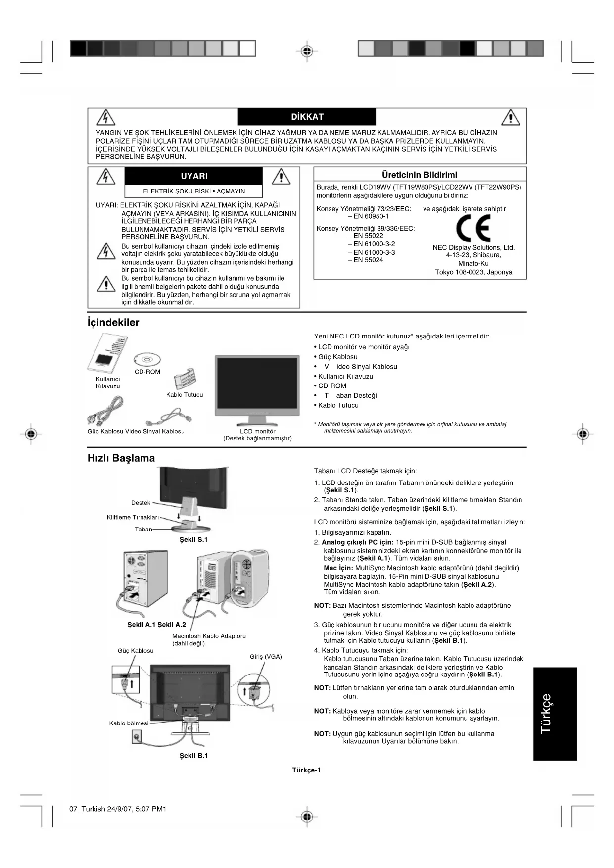 ∑LG∑LENEB∑LECE∏∑ HERHANG∑ B∑R PARÇA BULUNMAMAKTADIR. SERV∑S ∑Ç∑N YETK∑L∑ SERV∑S PERSONEL∑NE BAΩVURUN. Bu sembol kullan∂c∂y∂ cihaz∂n içindeki izole edilmemiµ voltaj∂n elektrik µoku yaratabilecek büyüklükte olduπu konusunda uyar∂r. Bu yüzden cihaz∂n içerisindeki herhangi bir parça ile temas tehlikelidir. Bu sembol kullan∂c∂y∂ bu cihaz∂n kullan∂m∂ ve bak∂m∂ ile ilgili önemli belgelerin pakete dahil olduπu konusunda bilgilendirir. Bu yüzden, herhangi bir soruna yol açmamak için dikkatle okunmal∂d∂r. UYARI ve aµa©∂daki iµarete sahiptir NEC Display Solutions, Ltd. 4-13-23, Shibaura, Minato-Ku Tokyo 108-0023, Japonya ∑çindekiler Yeni NEC LCD monitör kutunuz* aµa©∂dakileri içermelidir: